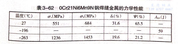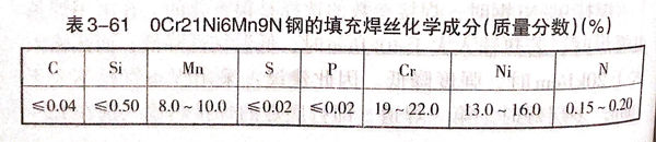 目前,0Cr21Ni6Mn9N鋼的焊接還僅限于TIG焊及真空電子束焊接。焊接參數可參照不(bu)銹鋼。填充焊絲的化學成分見表3-61.焊縫金屬的力學性能見表3-62。