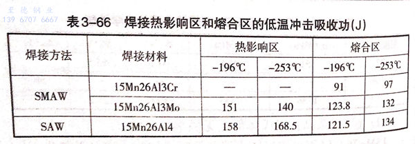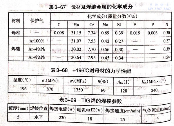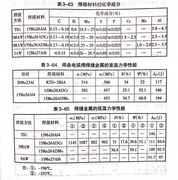 15Mn26Al14鋼可用SWAM、SAW及TIG方法(fa)焊(han)接(jie),其所用焊(han)接(jie)材料及力學(xue)性能(neng)在表3-63~表3-66中(zhong)給出。