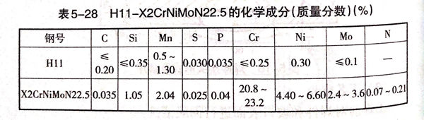 采用上述焊接材料和工藝(yi)得到的(de)H11-X2CrNiMoN22.5雙相不銹(xiu)鋼(gang)復合鋼(gang)板的(de)焊縫金屬化學成分見表5-32.