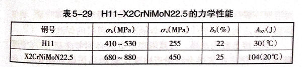在我國生產的4DM-PKM加壓汽化爐,爐體長期處于高溫高壓之下且在腐蝕介質中工作,選用了德國H11-X2CrNiMoN22.5雙相不銹(xiu)鋼(gang)復合(he)板制造。覆層材料為雙(shuang)相不銹鋼X2CrNiMoN22.5(相當于SAF2205),作為耐高溫耐腐蝕材料;基層選用碳鋼H11,用來滿足結構強度和剛度。其化學成分和力學性能分別見表5-28和表5-29.