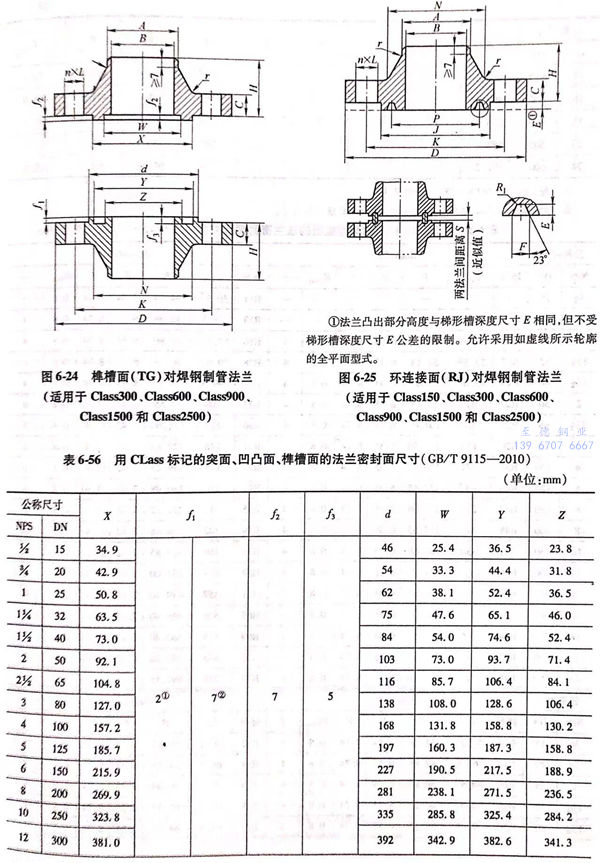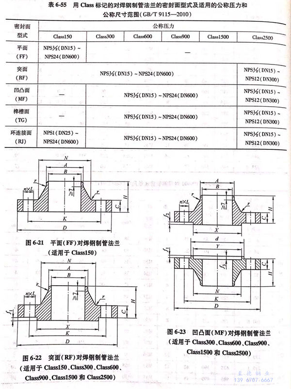 用Class標記的(de)(de)對焊鋼制管(guan)法蘭(lan)的(de)(de)密封面型(xing)式及(ji)適用的(de)(de)公(gong)稱壓力和公(gong)稱尺(chi)(chi)(chi)寸范(fan)圍見(jian)表(biao)6-55;用Class標記的(de)(de)對焊鋼制管(guan)法蘭(lan)的(de)(de)型(xing)式如圖(tu)6-21~圖(tu)6-25所示(shi),法蘭(lan)密封面尺(chi)(chi)(chi)寸見(jian)表(biao)6-56和表(biao)6-57,法蘭(lan)結構尺(chi)(chi)(chi)寸見(jian)表(biao)6-58~表(biao)6-63。