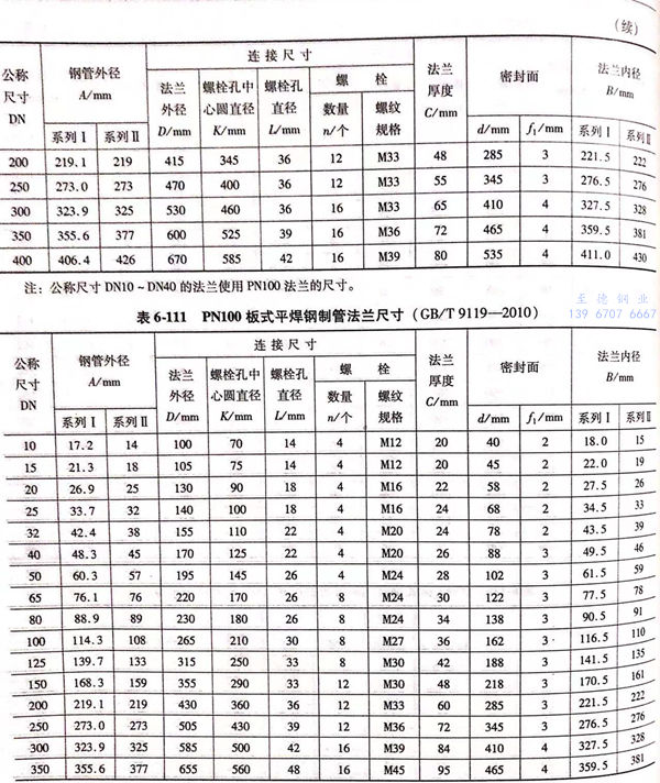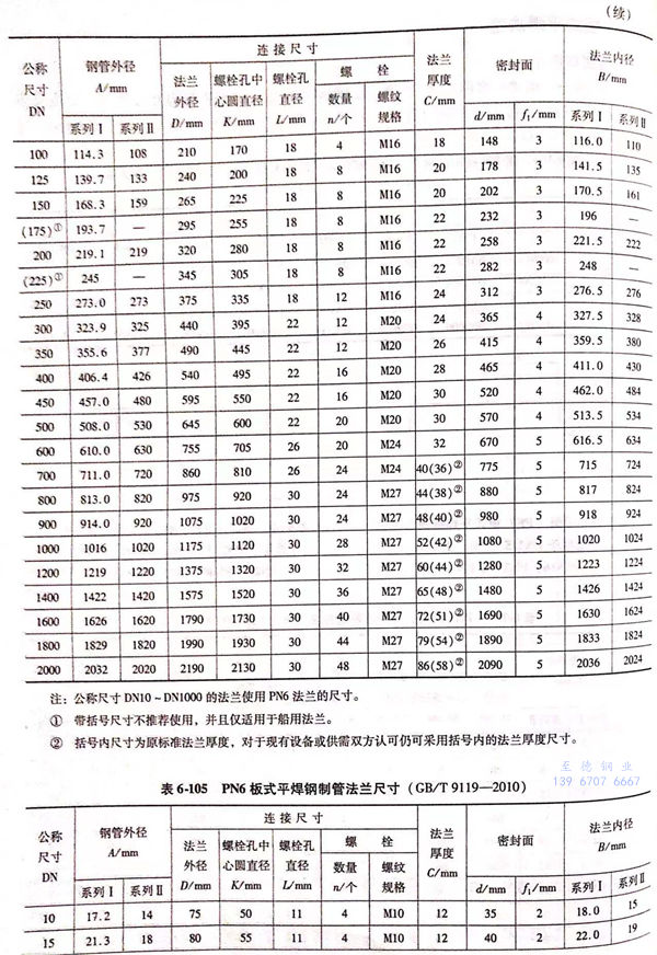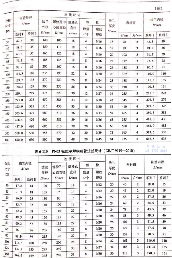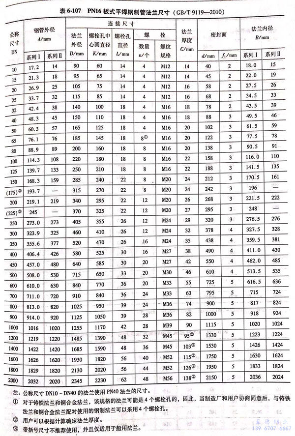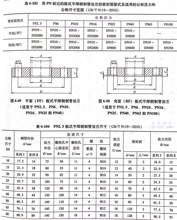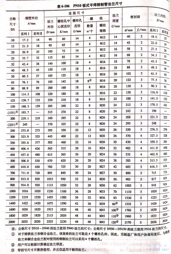 用PN標(biao)記的(de)板式平焊鋼制(zhi)管法(fa)(fa)蘭的(de)密封面型式及適用的(de)公稱(cheng)壓力和(he)公稱(cheng)尺寸范圍(wei)見表(biao)6-103;用PN標(biao)記的(de)板式平焊鋼制(zhi)管法(fa)(fa)蘭的(de)型式如(ru)圖(tu)6-49、圖(tu)6-50所示,法(fa)(fa)蘭的(de)結(jie)構尺寸見表(biao)6-104~表(biao)6-111。