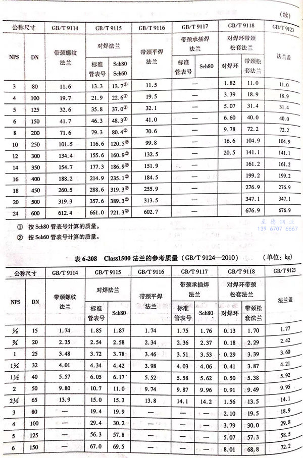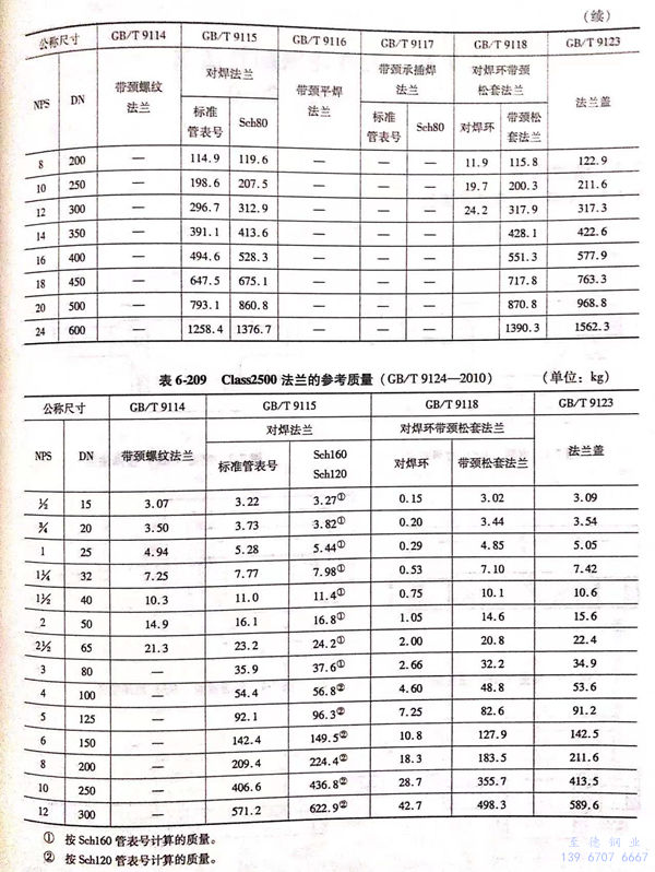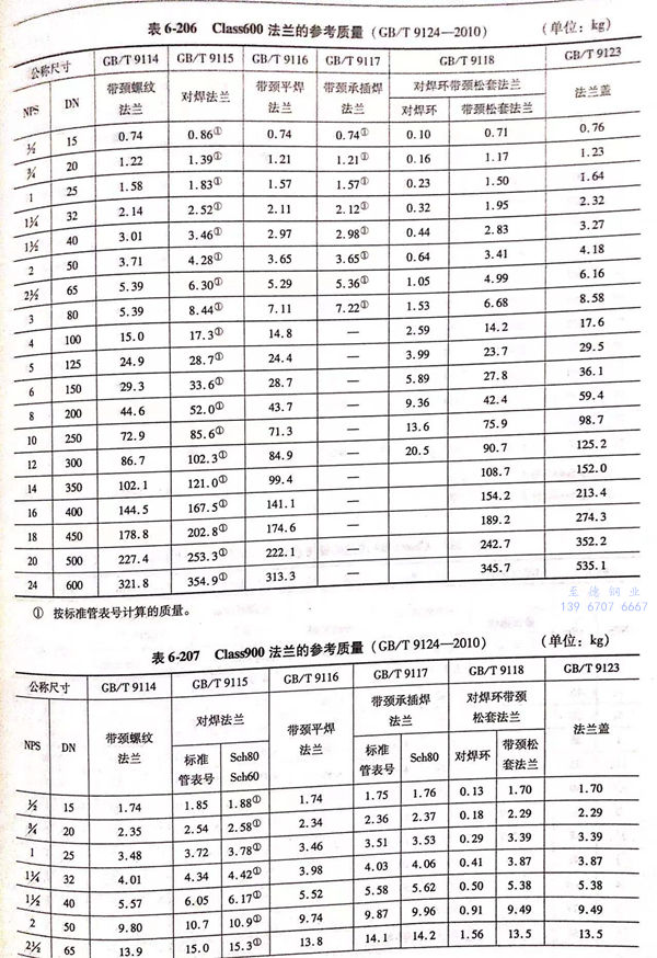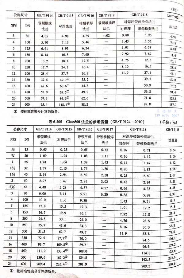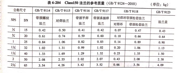 用 Class 標記的法蘭(lan)(包括 Class 150 ~ Class 2500 共6個壓力(li)級的法蘭(lan))的參(can)考(kao)質量見表6-204~表6-209。