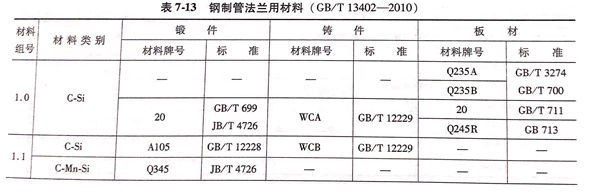 鋼制管法蘭用材料見表7-13. 不銹鋼法蘭材料的化學成分、力學性能、使用溫度和其他技術要求應符合表7-13中有關標準的規定。