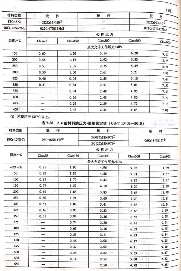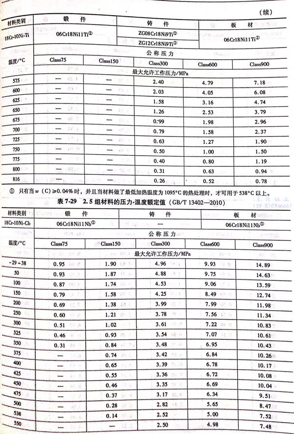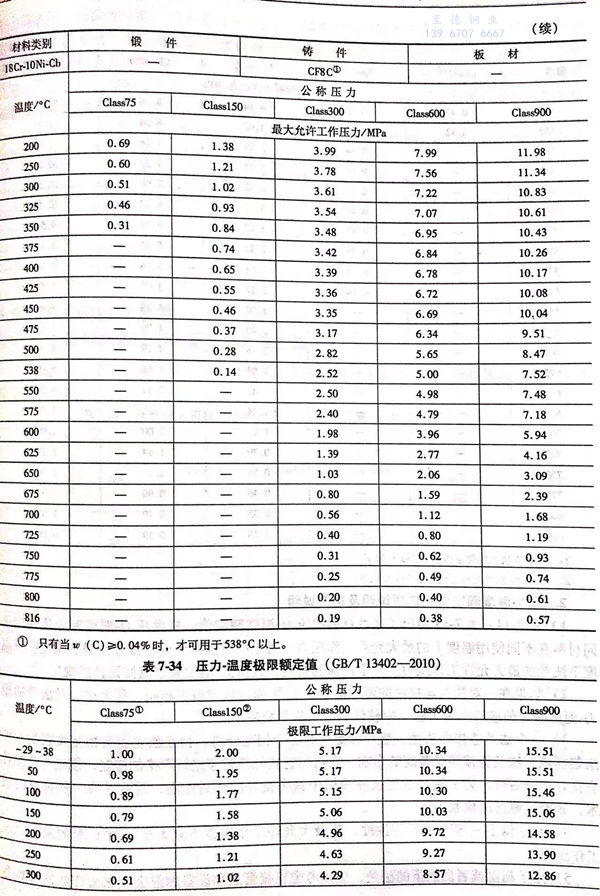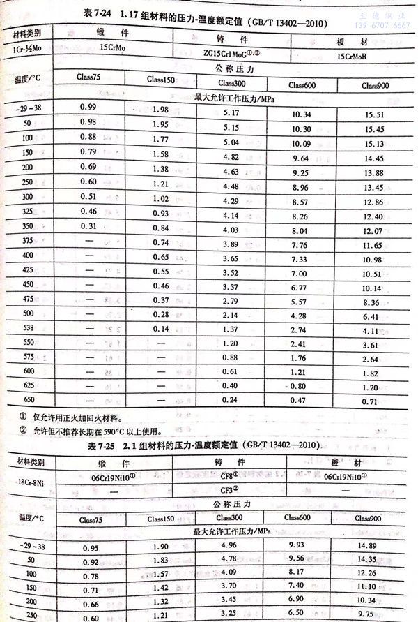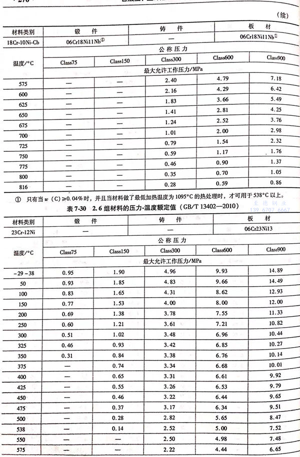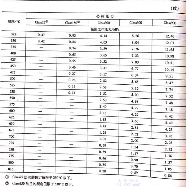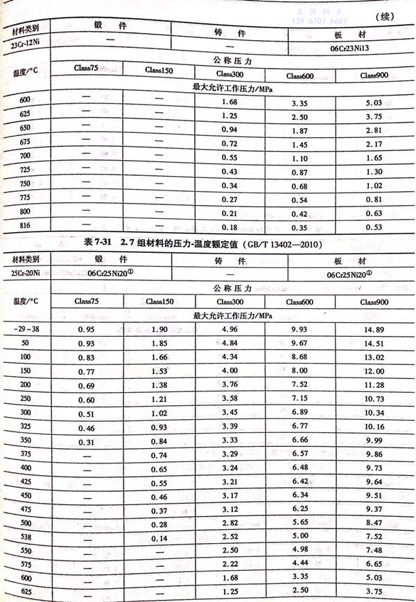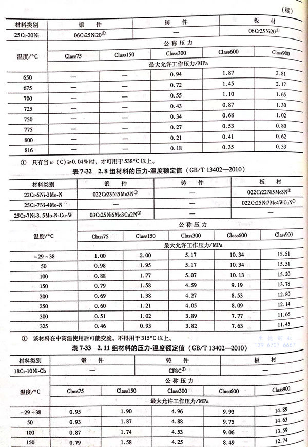 各組材料的不銹鋼法蘭(Class75~Class900)的壓力-溫度額定值見表7-14~表7-33。對于不銹鋼法(fa)蘭的壓力-溫度極限額定值見表7-34.表7-14~表7-33所規定的法蘭壓力-溫度額定值不得超過表7-34規定的極限額定值。