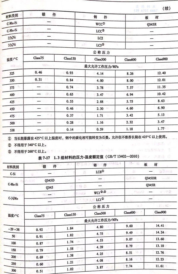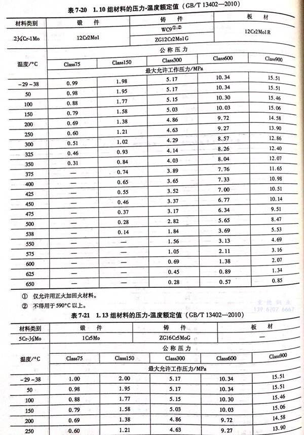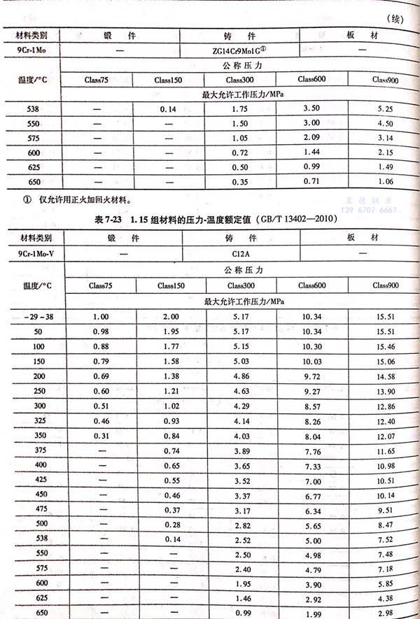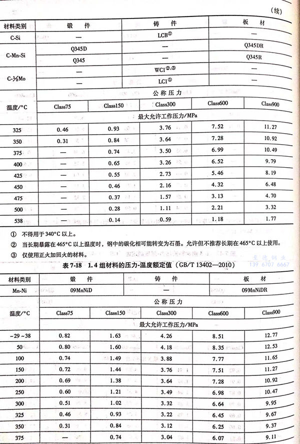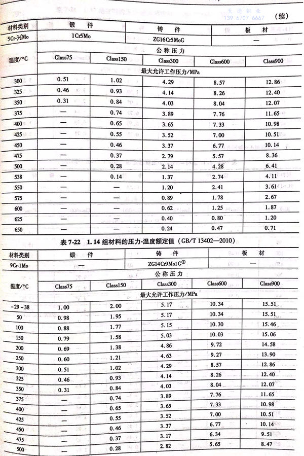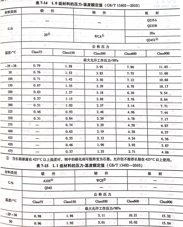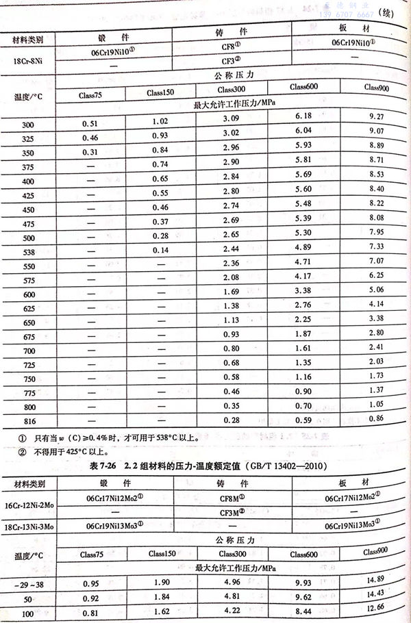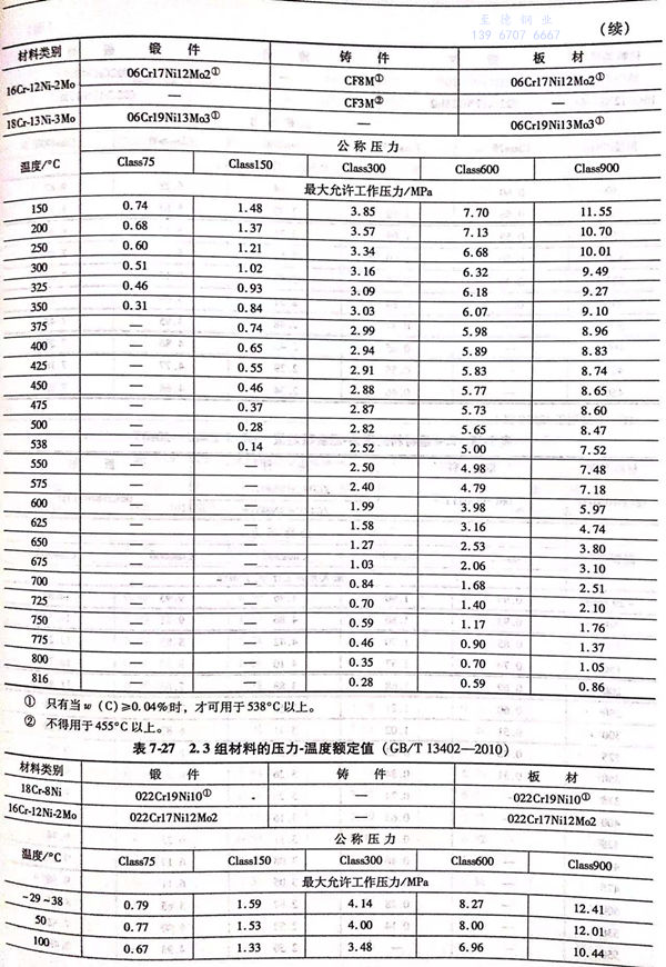 各組材料的不銹鋼法蘭(Class75~Class900)的壓力-溫度額定值見表7-14~表7-33。對于不銹鋼法(fa)蘭的壓力-溫度極限額定值見表7-34.表7-14~表7-33所規定的法蘭壓力-溫度額定值不得超過表7-34規定的極限額定值。