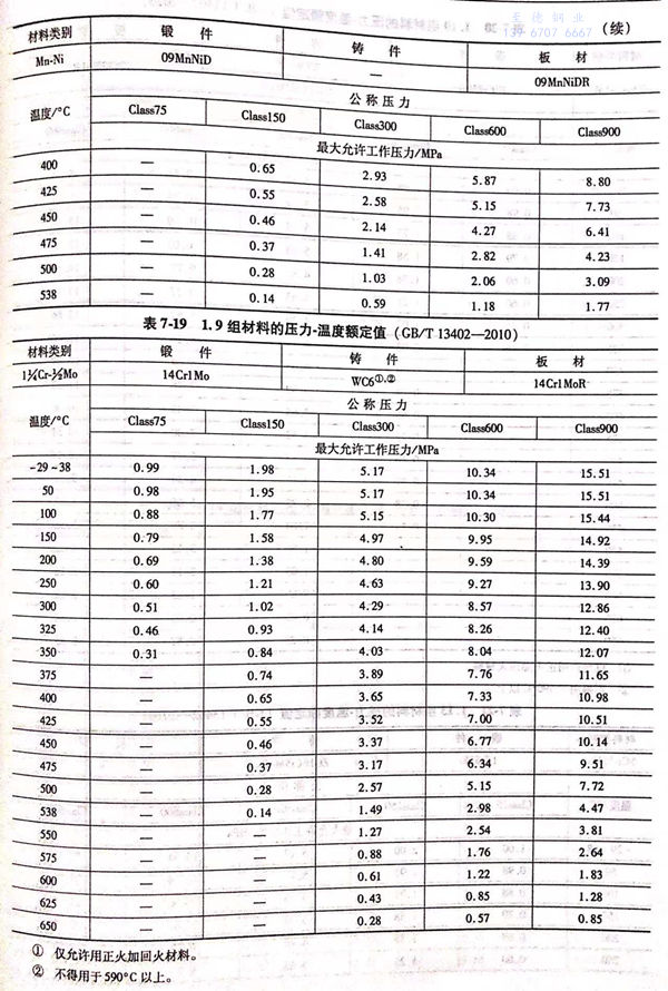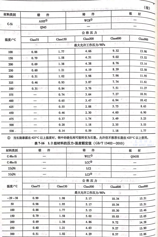 a. 表7-14~表7-33給(gei)出(chu)了法蘭材(cai)料的(de)壓力(li)-溫(wen)度(du)額(e)(e)定(ding)值(zhi),根據壓力(li)-溫(wen)度(du)額(e)(e)定(ding)值(zhi)確定(ding)不同材(cai)料在(zai)不同使用(yong)(yong)溫(wen)度(du)下的(de)最(zui)大(da)允許工作壓力(li),對(dui)于中間溫(wen)度(du)允許用(yong)(yong)線性內插(cha)法確定(ding)在(zai)該溫(wen)度(du)下法蘭的(de)最(zui)大(da)允許工作壓力(li)。對(dui)于特殊的(de)材(cai)料,其壓力(li)-溫(wen)度(du)額(e)(e)定(ding)值(zhi)按設(she)計的(de)規定(ding)。