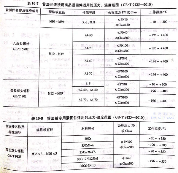 根據緊固(gu)件(jian)的(de)(de)型式與尺寸(cun)、性能等級或材料牌號確定其適(shi)用(yong)的(de)(de)壓(ya)力(li)和工作溫(wen)(wen)度范圍(wei)(wei)。對于管(guan)法蘭連(lian)接(jie)用(yong)商(shang)品緊固(gu)件(jian)適(shi)用(yong)的(de)(de)壓(ya)力(li)、溫(wen)(wen)度范圍(wei)(wei)見表10-7;對于管(guan)法蘭專用(yong)緊固(gu)件(jian)適(shi)用(yong)的(de)(de)壓(ya)力(li)、溫(wen)(wen)度范圍(wei)(wei)見表10-8.