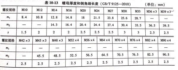 m-螺母最(zui)大厚度(du),數值按表10-13確定,與(yu)螺栓配合時用(yong)m1,與(yu)螺柱配合時用(yong)m2,單(dan)位為(wei)毫米(mm);