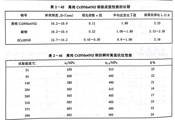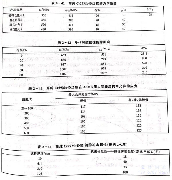 高純(Cr29Mo4Ni2)S44800不銹鋼的化學成分見(jian)表2-40。