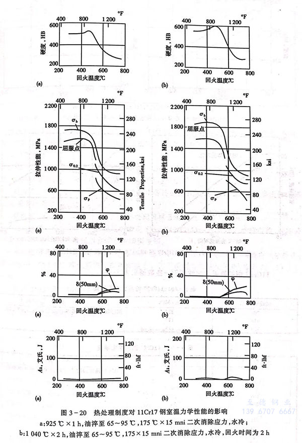7Cr17、68Cr17、440A不(bu)銹鋼(gang)、8Cr17、85Cr17、440B不(bu)銹鋼(gang)、11Cr17、108Cr17、440C不(bu)銹鋼(gang)的高溫(wen)力學(xue)性(xing)能(neng)見(jian)圖3-21。在482℃回火,保溫(wen)時間和軟化效果(guo)見(jian)圖3-22。