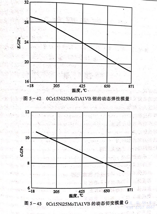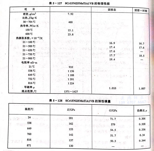 0Cr15Ni25MoTiA1VB、A-286 不(bu)銹鋼的物(wu)理性能見表(biao)5-127,表(biao)5-128和圖5-42、圖5-43。