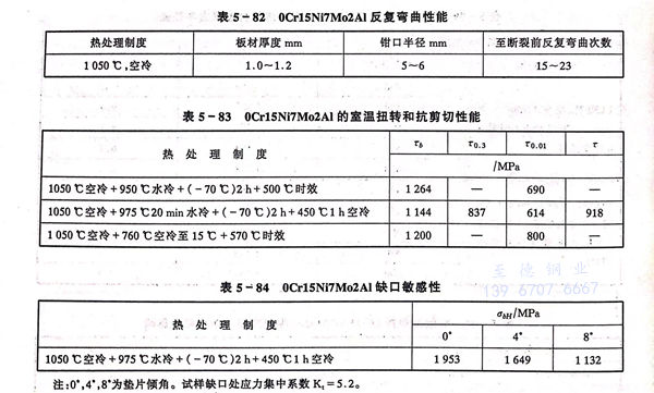 07Cr15Ni7Mo2Al、PH15-7Mo 不銹鋼的疲勞性能(neng)見(jian)表(biao) 5-85,斷裂韌性見(jian)表(biao) 5-86。