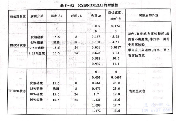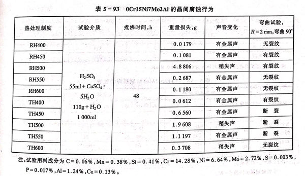 07Cr15Ni7Mo2Al、PH15-7Mo 不銹鋼的(de)耐(nai)(nai)均勻(yun)腐(fu)(fu)蝕(shi)(shi)性(xing)能(neng)(neng)見(jian)表5-92,耐(nai)(nai)晶(jing)間腐(fu)(fu)蝕(shi)(shi)性(xing)能(neng)(neng)見(jian)表5-93。鋼的(de)耐(nai)(nai)晶(jing)間腐(fu)(fu)蝕(shi)(shi)性(xing)能(neng)(neng)與熱處(chu)理條件(jian)相關:RH處(chu)理制度500℃時效(xiao)強度最高,此時鋼不耐(nai)(nai)晶(jing)間腐(fu)(fu)蝕(shi)(shi);400~450℃或550~600℃時效(xiao)鋼的(de)強度稍低,但耐(nai)(nai)晶(jing)間腐(fu)(fu)蝕(shi)(shi)。TH處(chu)理制度,不論是何種時效(xiao)溫度(400~600℃)均出現晶(jing)間腐(fu)(fu)蝕(shi)(shi)。