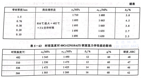 00Cr12Ni10AlTi 不(bu)銹鋼(gang)在退(tui)火條件下具有較高的(de)抗拉強(qiang)度(du)和屈服強(qiang)度(du),且塑性和韌性良好。通過簡單的(de)時(shi)效(xiao)處(chu)理(li),其強(qiang)度(du)水平較退(tui)火狀態提高1倍,同時(shi)保留了足夠的(de)塑韌性。00Cr12Ni10AITi 不(bu)銹鋼(gang)棒材(cai)、帶材(cai)及時(shi)效(xiao)處(chu)理(li)對室溫(wen)力學性能的(de)影響見表5-61至(zhi)表5-63。