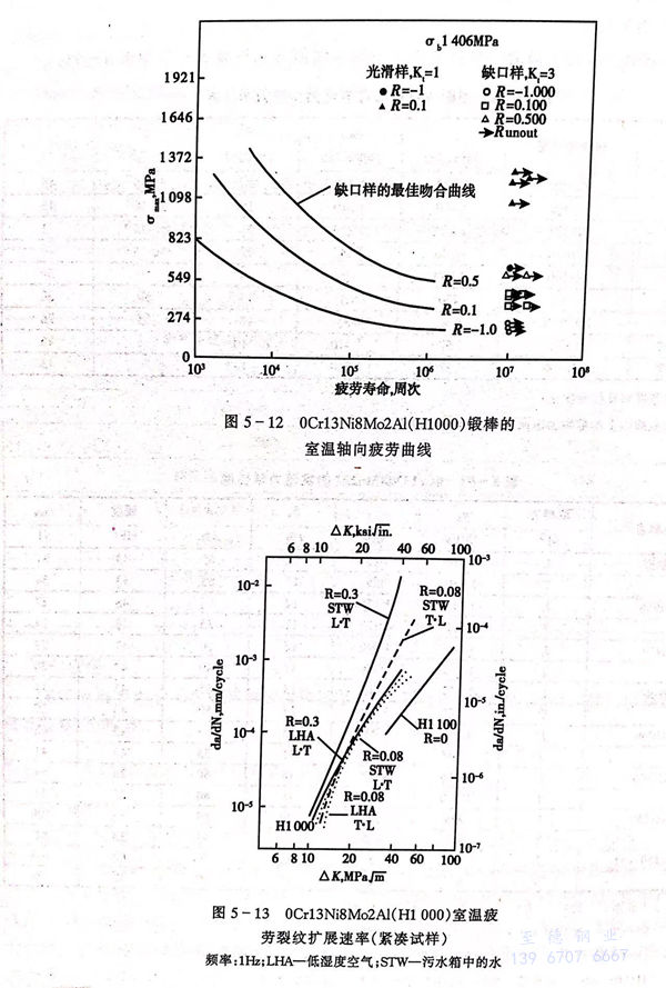 04Cr13Ni8Mo2Al、0Cr13Ni8Mo2Al、PH13-8Mo 不(bu)銹鋼(gang)的(de)(de)軸(zhou)向疲勞性能和(he)裂紋擴展速率分(fen)別見圖 5-12 和(he) 圖 5-13 。緊湊試(shi)樣的(de)(de)斷裂韌(ren)性數據見表 5-54 。