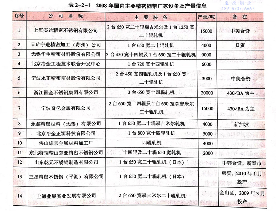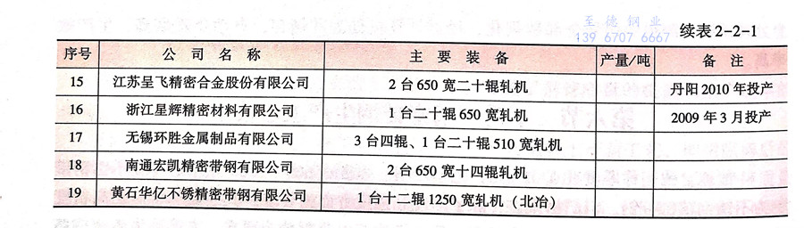 相比于國外20世紀30年代就起步的生產歷史,我國不(bu)銹鋼精密帶鋼的生產歷史較短,始于1998年上海五鋼有限公司與美國阿利格尼路德盧姆(Allegheny Ludlum)公司合資組建的上海實達不銹鋼有限公司。到2008年,我國規模較大(已投產企業)的不銹鋼(gang)精密帶鋼(gang)生產企業近十家,年產不銹鋼精密帶鋼達94980噸。表2-2-1為2008年國內主要精密帶鋼公司設備和產量情況。