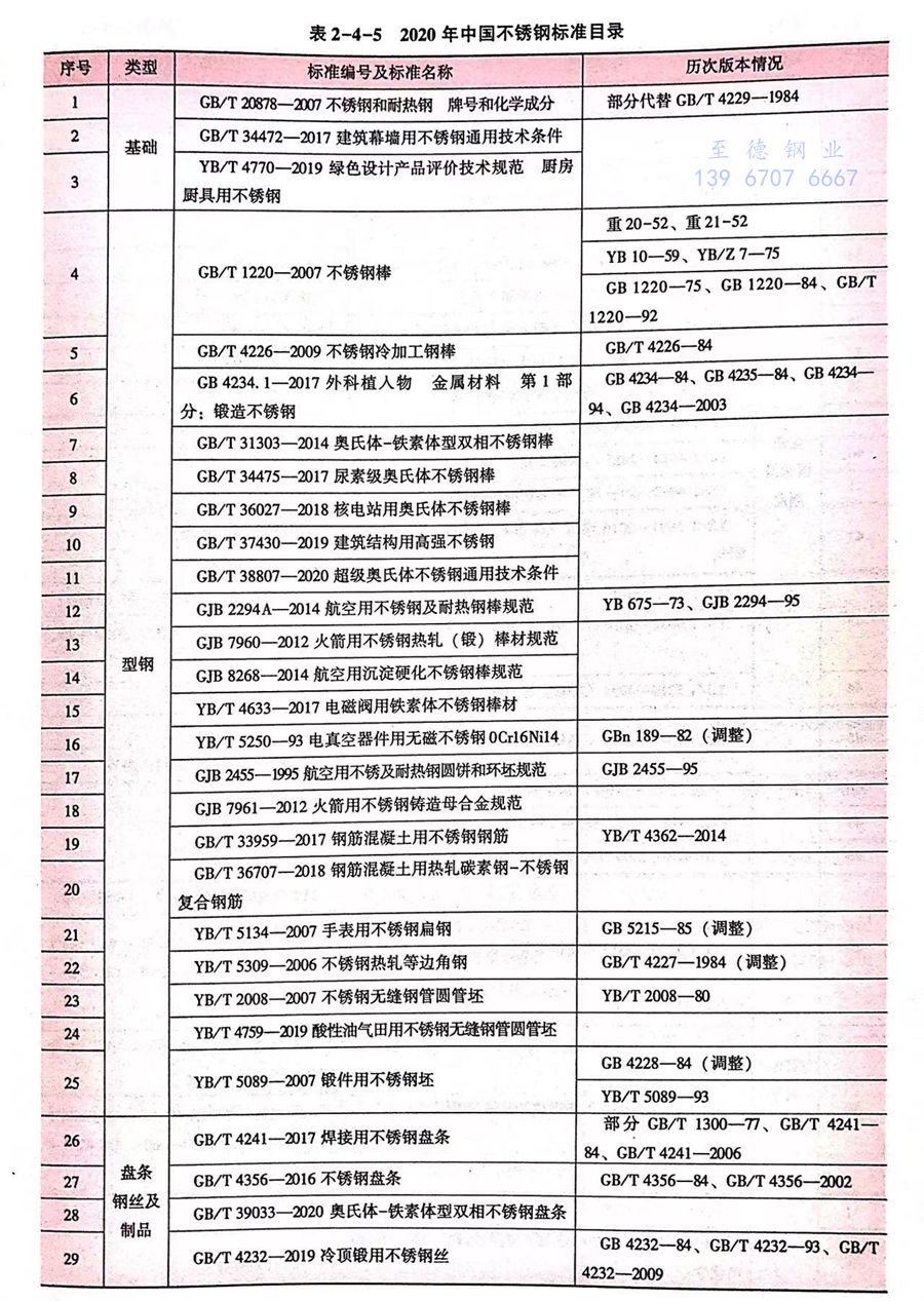 隨著我國(guo)不銹(xiu)(xiu)(xiu)鋼(gang)(gang)工(gong)藝與(yu)裝備水(shui)平的不斷突破和進步,使制(zhi)造成本(ben)大(da)(da)(da)幅下降,加之人(ren)們對不銹(xiu)(xiu)(xiu)鋼(gang)(gang)產品全生命周期綜合成本(ben)的重(zhong)視程度(du)不斷提高,極大(da)(da)(da)地推動了不銹(xiu)(xiu)(xiu)鋼(gang)(gang)在各產業大(da)(da)(da)量使用,進一(yi)步提高了不銹(xiu)(xiu)(xiu)鋼(gang)(gang)標(biao)準(zhun)(zhun)制(zhi)修訂(ding)(ding)的速度(du)和數量,從2011年至2020年,我國(guo)共(gong)制(zhi)修訂(ding)(ding)不銹(xiu)(xiu)(xiu)鋼(gang)(gang)標(biao)準(zhun)(zhun)89項(xiang),其中新(xin)(xin)(xin)制(zhi)定(ding)了核電、汽車(che)、城市(shi)軌道車(che)輛、貨運車(che)輛、石油、化工(gong)、船舶、橋梁、電力、環保、建筑(zhu)及航(hang)天航(hang)空等(deng)重(zhong)點領域(yu)急需標(biao)準(zhun)(zhun)63項(xiang)(國(guo)家(jia)標(biao)準(zhun)(zhun)41項(xiang),國(guo)家(jia)軍用標(biao)準(zhun)(zhun)10項(xiang),行業標(biao)準(zhun)(zhun)12項(xiang)),不銹(xiu)(xiu)(xiu)鋼(gang)(gang)標(biao)準(zhun)(zhun)總數達到115項(xiang)(見表2-4-5)。這些標(biao)準(zhun)(zhun)的制(zhi)修訂(ding)(ding)與(yu)實施,極大(da)(da)(da)地推動了鐵(tie)素(su)體(ti)型、奧氏體(ti)-鐵(tie)素(su)體(ti)型、超級不銹(xiu)(xiu)(xiu)鋼(gang)(gang)型和高強度(du)不銹(xiu)(xiu)(xiu)鋼(gang)(gang)等(deng)新(xin)(xin)(xin)牌號、新(xin)(xin)(xin)品種研發與(yu)應用。