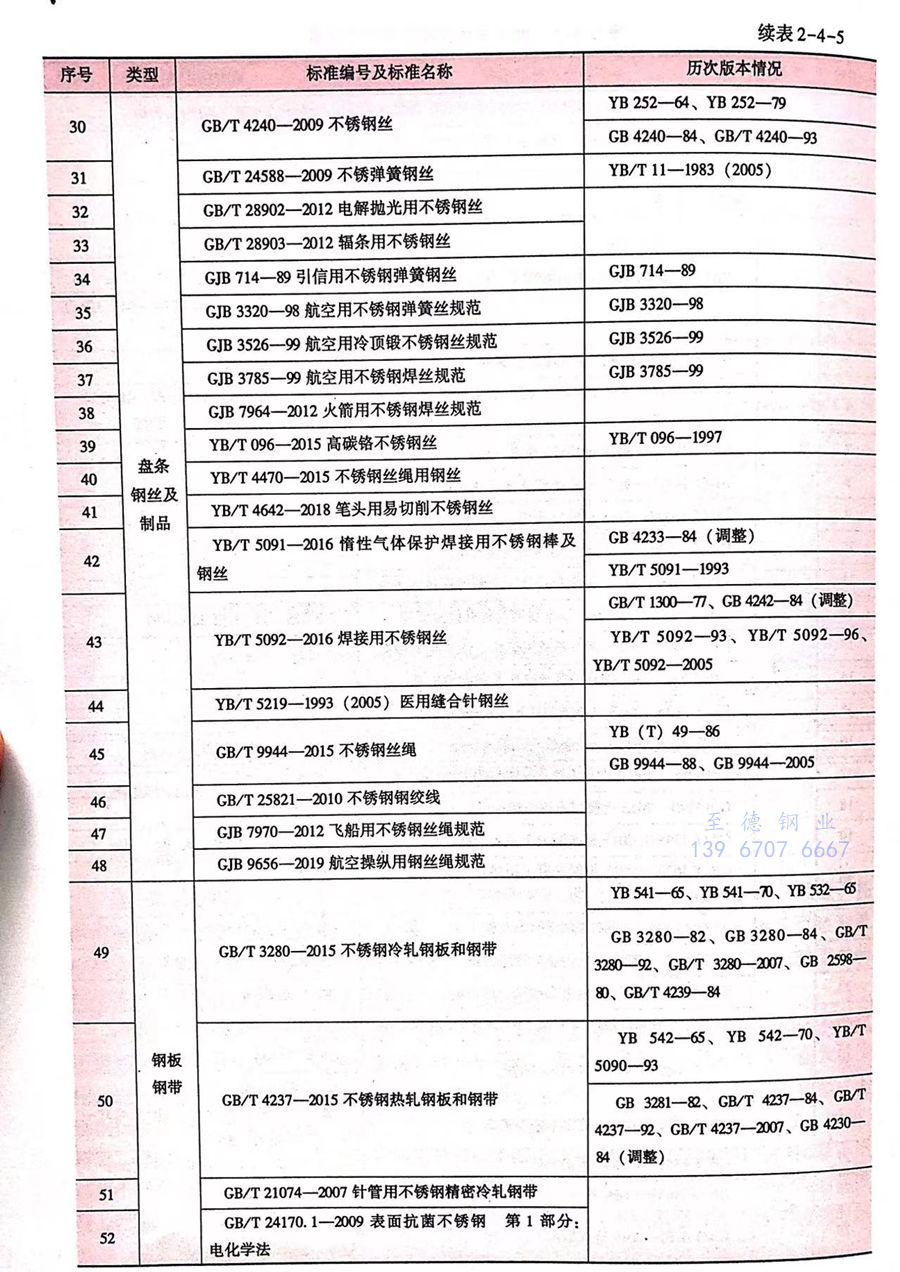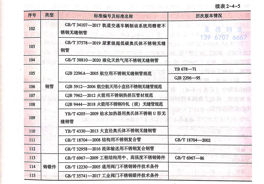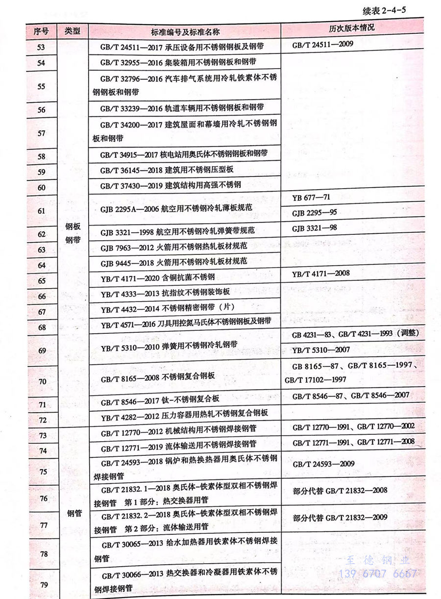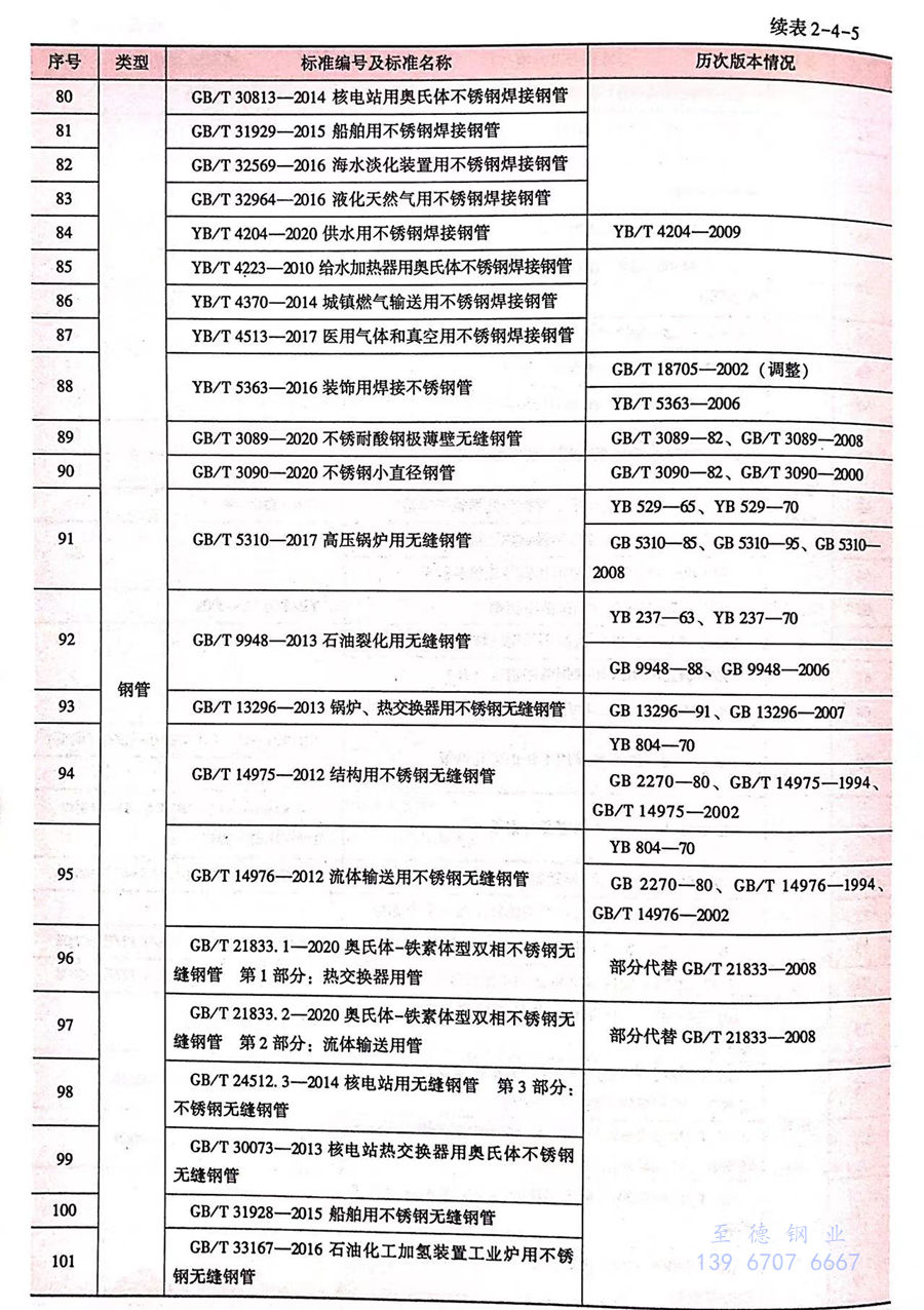 《高壓鍋爐用無縫鋼管》(GB 5310-2008)、《石油裂化用無縫鋼管》(GB 9948-2013)、《承壓設備用不銹鋼鋼板及鋼帶》(GB 24511-2009)、《核電站用無縫鋼管 第3部分:不銹鋼無縫鋼管》(GB 24512.3-2014)、《承壓設備用無縫復合鋼管》(GB 28883-2013)、《核電站用奧氏體不銹鋼焊(han)接(jie)鋼管》(GB 30813-2014)、《核電站用奧氏體不銹鋼棒》(GB/T36027-2018)。同時,還廢止了《磁頭用不銹鋼冷軋鋼帶》(YB/T 085-2007)、《彩色顯像管彈簧用不銹鋼冷軋鋼帶》(YB/T 110-2011)、《手表用不銹鋼冷軋鋼帶》(YB/T 5133-2007)、《S型釬焊不銹鋼金屬軟管》(YB/T 5307-2006)等4項行業標準(見表2-4-5)。