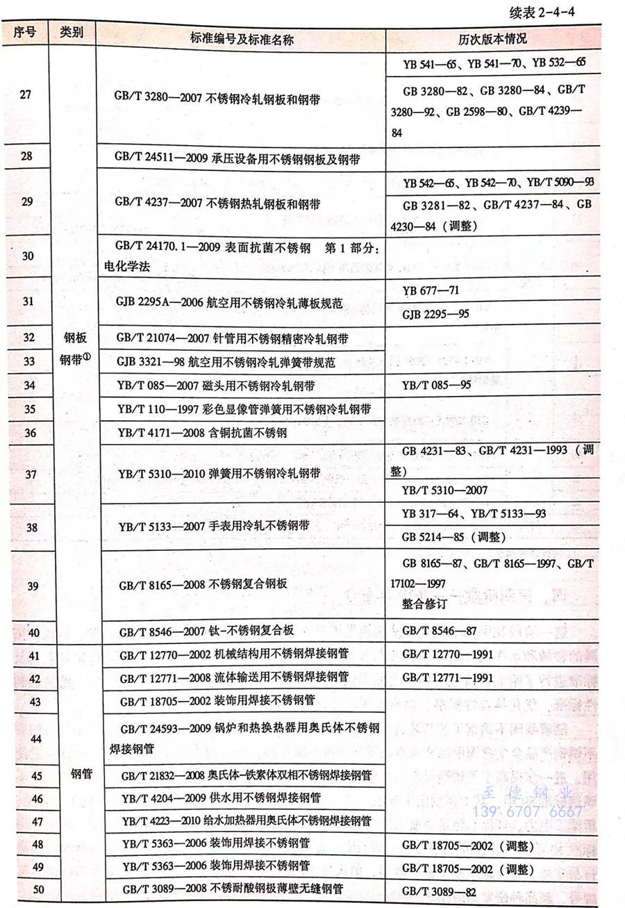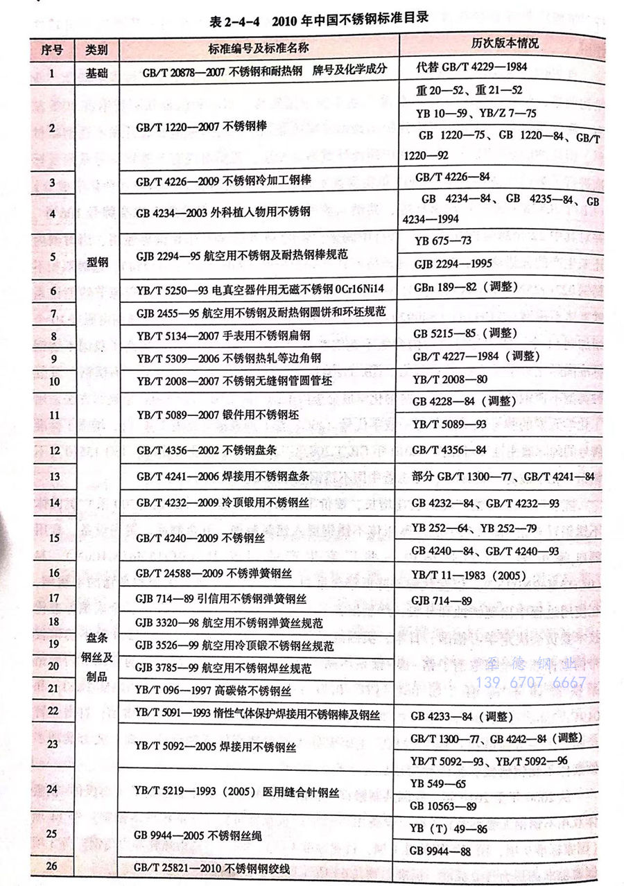 從2000年至2010年,我國共制修訂不銹鋼標準46項,其中新制定了《奧氏體-鐵素體雙相不銹(xiu)鋼無(wu)縫鋼管》《承壓設備用不銹鋼鋼板及鋼帶》《含銅抗菌不銹鋼》等14項(國家標準9項,國家軍用標準1項,行業標準4項),將《不銹鋼熱軋等邊角鋼》等3項國家標準調整為行業標準,標準總數共63項(見表2-4-4)。