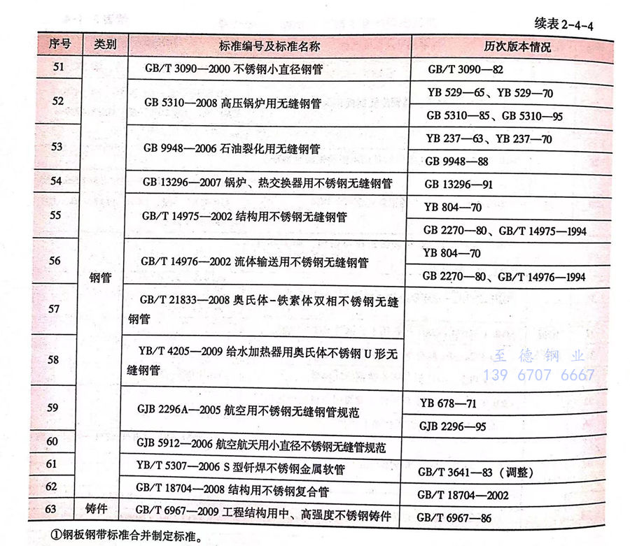 自2001年我國加入WTO以后,隨著經濟發展、工業化戰略實施、技術革新及產業結構調整,全球不銹鋼生產消費重心逐步向中國轉移。當時我國鎳系不銹鋼占80%左右,鎳資源短缺及昂貴,成為我國不銹鋼發展的瓶頸。同時國家面臨著開發不銹鋼新材料、新品種的艱巨任務。為了適應國內外貿易的發展,我國對現有不銹鋼牌號系列及標準進行了第四次清理整頓。2007年我國首次制定了《不銹鋼和耐熱鋼牌號和化學成分》(GB/T 20878-2007)國家標準,共納入牌號143個,其中采用現有標準牌號106個,并對其中22個牌號的化學成分進行了調整;新增37個牌號,包括世界通用、當時國內還未生產的先進牌號,如超級奧氏體不銹鋼015Cr20Ni18Mo6CuN(S31254),超級雙相不銹鋼022Cr25Ni7Mo3WCuN(S31260)、03Cr25Ni6Mo3Cu2N(S32550)及資源節約型鉻系鐵素體不銹鋼022Cr11Ti(S40920)、019Cr18MoTi(S43670)等,含氮不銹鋼由原來10個增加到51個,極大地推進國內含氮不銹鋼牌號的研發、生產和應用。提高了我國不銹鋼標準國際化水平及產品的競爭力。GB/T 20878-2007標準中首次給出了“不銹鋼”及五種類型不銹鋼的定義,確定不銹鋼化學成分極限值的一般準則。不銹鋼牌號表示方法采用了化學元素的牌號表示法和統一數字代號(ISC)法并列表示(見表2-4-1),增強了標準牌號的國際通用性和可比性。2010年GB/T 20878-2007標準牌號已被列入ISO 15510《不銹鋼 化學成分》附錄中,標志著中國不銹鋼牌號贏得了世界的認可。