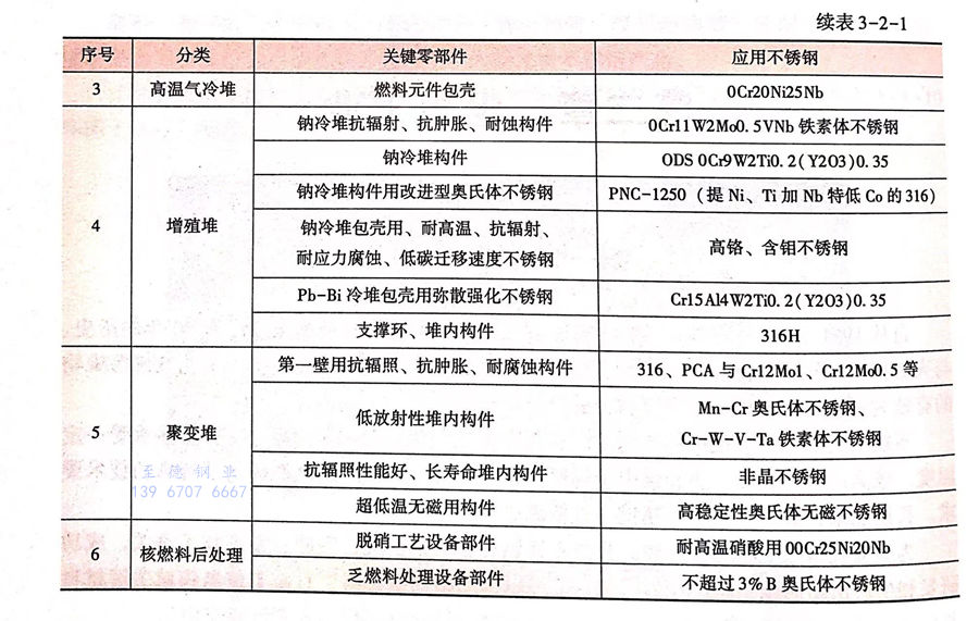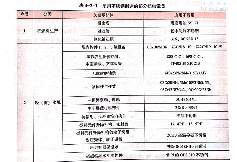 不銹(xiu)鋼管是用于核電設備制造的關鍵材料之一(見表3-2-1),要求材料能夠承受一定溫度、較高壓力、腐蝕介質和強中子輻照,這些都對不銹鋼管產品性能提出了特殊的技術要求。長期以來,我國核電用不銹鋼管一直依靠進口。