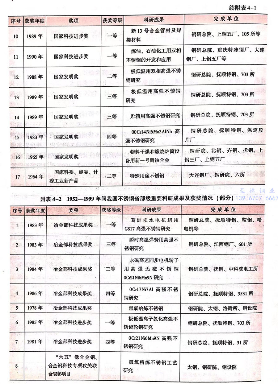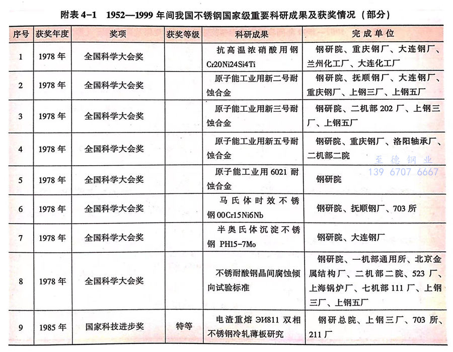 1952-1999年,是我國不銹鋼的開端與創業期。我國不(bu)銹(xiu)鋼的發展一直伴隨著鋼鐵產品的研究和創新。作為我國最早開展不銹鋼和高鎳耐蝕合金研究和工程應用,并建立不銹鋼專業研究組、室的科研單位,鋼鐵研究總院和其他兄弟單位共同見證了我國不銹鋼事業由消化吸收到創新的艱辛歷程。附表4-1和附表4-2展示了1952-1999年我國不銹鋼重要科研成果及獲獎情況(部分)。