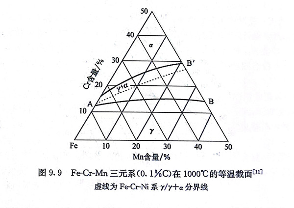 圖9.7為(wei)Fe-Cr-Ni三(san)元(yuan)系在高(gao)溫的(de)相(xiang)圖,可以看出,由于鎳的(de)存在,在1100℃下(xia),y相(xiang)區擴展到(dao)較高(gao)的(de)鉻含量,這(zhe)種高(gao)溫穩(wen)定的(de)γ相(xiang)急(ji)冷(leng)到(dao)室(shi)溫,形(xing)成如圖9.8所(suo)示的(de)室(shi)溫下(xia)的(de)各種亞穩(wen)相(xiang)及穩(wen)定相(xiang)。