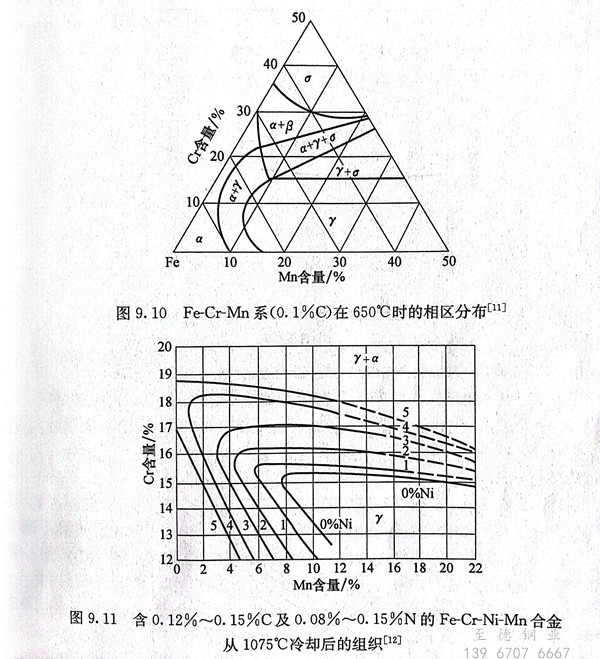 雖然錳和鎳一樣可以擴展和穩定y相,但在奧氏體不銹鋼(gang)中用錳完全代替鎳是有困難的。根據Fe-Cr-Mn三元相圖(圖9.9及圖9.10),當鉻含量大于15%時,錳含量的增加并不能避免α相的出現。為了節約鎳,在18Cr-8Ni 奧氏體不銹鋼中,可以用8%Mn代替其中的4%Ni。圖9.11為Fe-Cr-Ni-Mn相圖,可以看出,在Cr-Mn鋼中加入少量的氮可使獲得奧氏體組織所需的鎳含量大大減少。圖9.12也表明,在含18.5%Cr的鋼中,加入少量的氮可以顯著減少為獲得奧氏體所需的鎳含量。
