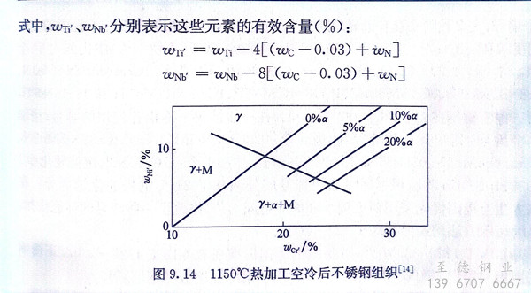 圖(tu)9.14是從大量Cr-Ni奧氏體不銹(xiu)鋼的(de)試驗數據中整理(li)得到的(de),適用于(yu)1150℃熱加工后冷(leng)卻狀態的(de)不銹(xiu)鋼組(zu)織。該圖(tu)考慮了元素間的(de)交互作用: