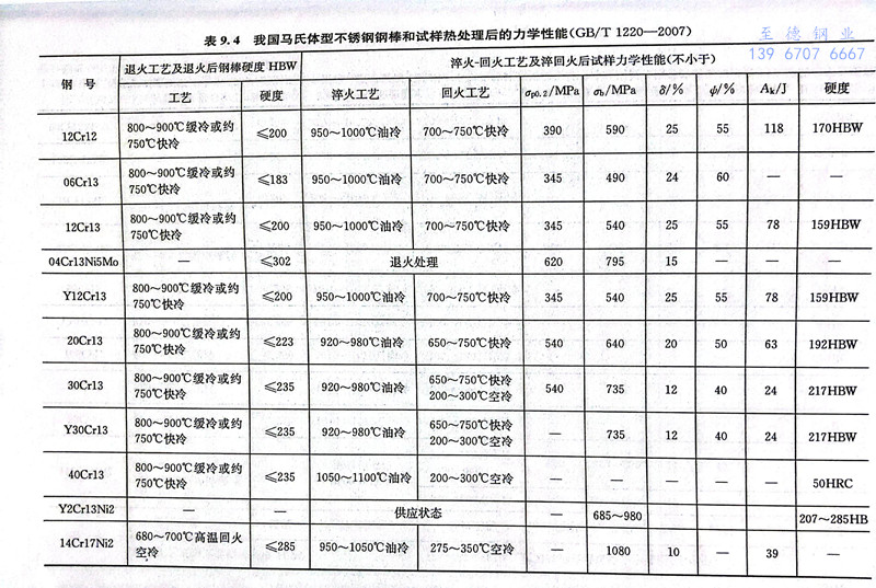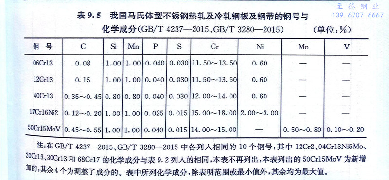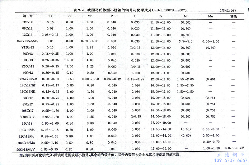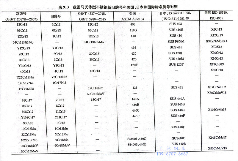 馬氏體不銹鋼在正常淬火溫度下是純奧氏體組織,淬火后的基體組織為馬氏體。如果鋼中含有較高的碳,在奧氏體化時仍保留部分未溶碳化物,淬火后的組織為馬氏體十碳化物及少量殘余奧氏體。表9.2為GB/T 20878-2007中列入的21個馬氏體(ti)不銹鋼的鋼號與化學成分。表9.3為我國馬氏體不銹鋼新舊牌號和相應美國、日本和國際標準牌號的對照。表9.4為我國馬氏體型不銹鋼鋼棒和試樣熱處理后的力學性能。表9.5為馬氏體型不銹鋼熱軋鋼板和鋼帶及冷軋(ya)鋼板和鋼帶的化學成分。