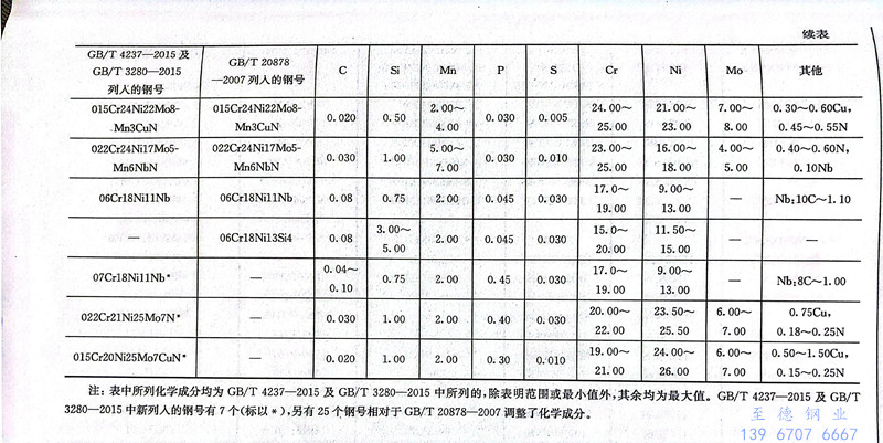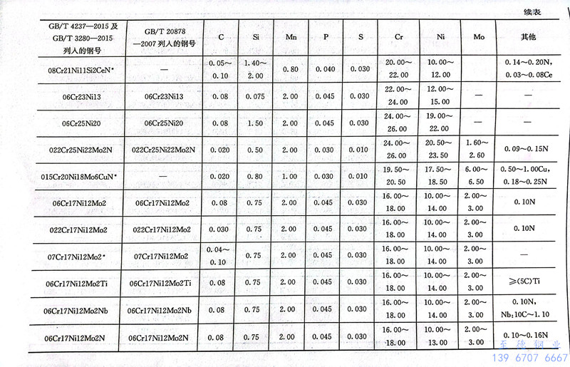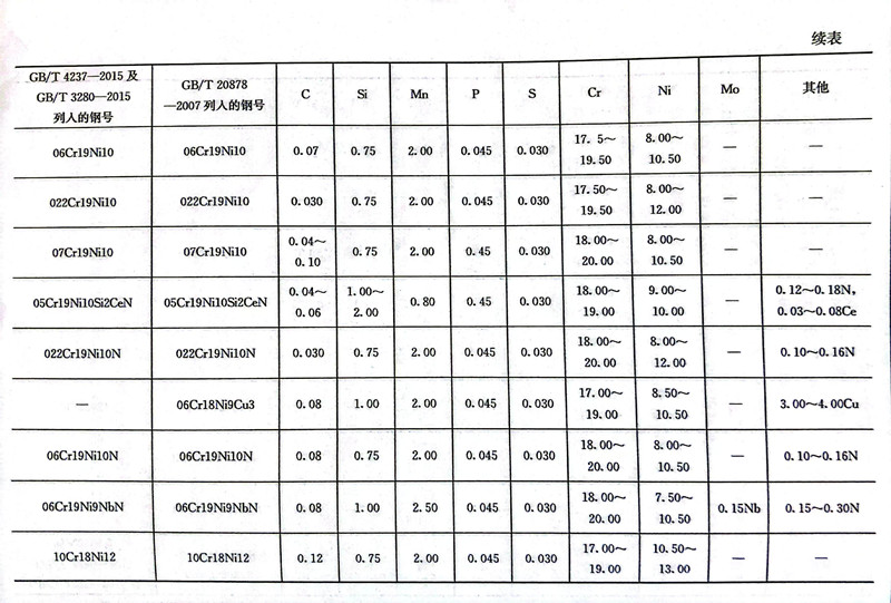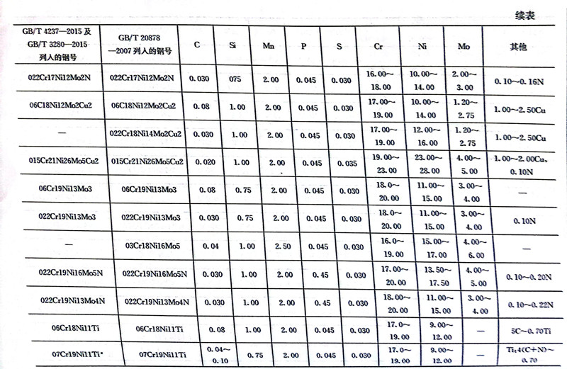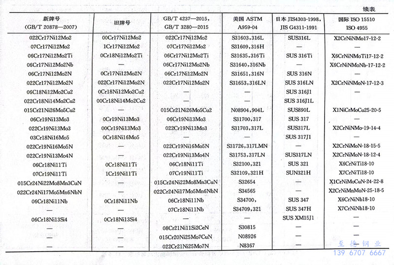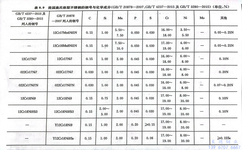在GB/T 20878-2007中列(lie)(lie)入了42個奧(ao)(ao)(ao)氏(shi)體(ti)(ti)(ti)型不(bu)銹(xiu)鋼(gang)的(de)(de)牌號(hao)。在新修訂的(de)(de)GB/T 4237-2015及GB/T 3280-2015中列(lie)(lie)人的(de)(de)奧(ao)(ao)(ao)氏(shi)體(ti)(ti)(ti)型不(bu)銹(xiu)鋼(gang)的(de)(de)牌號(hao)有39個,有7個是新加入的(de)(de),其中5個是GB/T 20878-2007中未(wei)列(lie)(lie)入的(de)(de)。表9.9為(wei)GB/T 20878-2007、GB/T 4237-2015及GB/T 3280-2015中列(lie)(lie)入的(de)(de)我國奧(ao)(ao)(ao)氏(shi)體(ti)(ti)(ti)型不(bu)銹(xiu)鋼(gang)的(de)(de)鋼(gang)號(hao)及其化學(xue)(xue)成(cheng)分。表9.10為(wei)我國奧(ao)(ao)(ao)氏(shi)體(ti)(ti)(ti)型不(bu)銹(xiu)鋼(gang)新舊牌號(hao)和相應(ying)美國、日本和國際標準牌號(hao)的(de)(de)對照。表9.11為(wei)奧(ao)(ao)(ao)氏(shi)體(ti)(ti)(ti)型不(bu)銹(xiu)鋼(gang)鋼(gang)棒(bang)的(de)(de)熱處理與力學(xue)(xue)性能。表9.12為(wei)奧(ao)(ao)(ao)氏(shi)體(ti)(ti)(ti)型不(bu)銹(xiu)鋼(gang)鋼(gang)板和鋼(gang)帶熱處理后的(de)(de)力學(xue)(xue)性能。