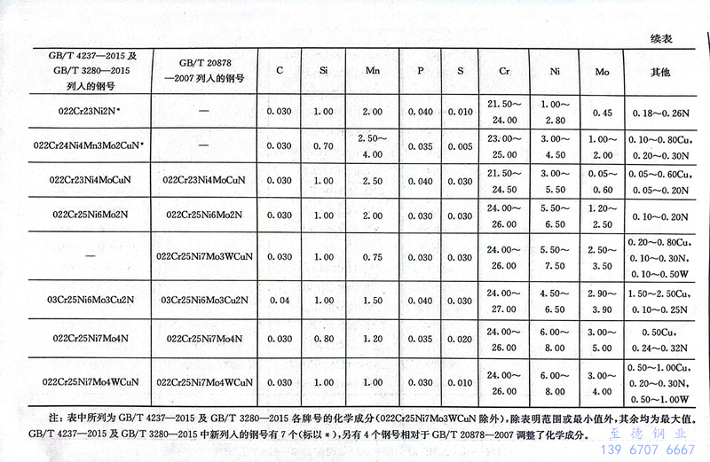 在GB/T 20878-2007中列入了11個奧氏體-鐵素體型雙相(xiang)不(bu)銹鋼(gang)的牌號,表9.13為這些奧氏體-鐵素體型不銹鋼和GB/T 4237-2015 及 GB/T 3280-2015中列入的奧氏體-鐵素體型雙相不銹鋼的鋼號與化學成分。表9.14為我國奧氏體-鐵素體型雙相不銹鋼新舊牌號和相應美國、日本和國際標準牌號的對照。表9.15為奧氏體-鐵素體型雙相不銹鋼的熱處理與力學性能。