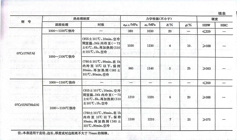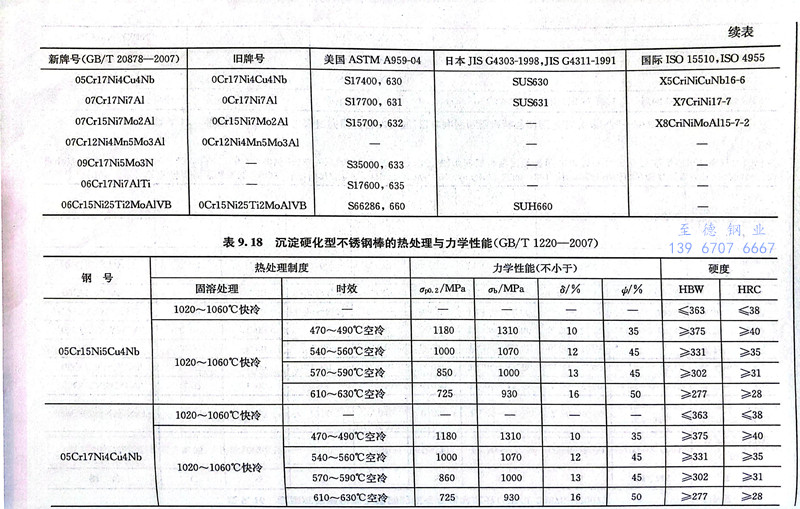 表9.16為GB/T 20878-2007列入的10個沉淀硬化不銹鋼(gang)的鋼號與化學成分。表9.17為我國沉淀硬化型不銹鋼新舊牌號和相應美國、日本和國際標準牌號的對照。表9.18為沉淀硬化型不銹鋼棒的熱處理與力學性能(GB/T 1220-2007)。表9.19和表9.20分別為沉淀硬化型不銹鋼冷軋鋼板和鋼帶固溶處理后和沉淀硬化處理后的力學性能(GB/T 3280-2015)。