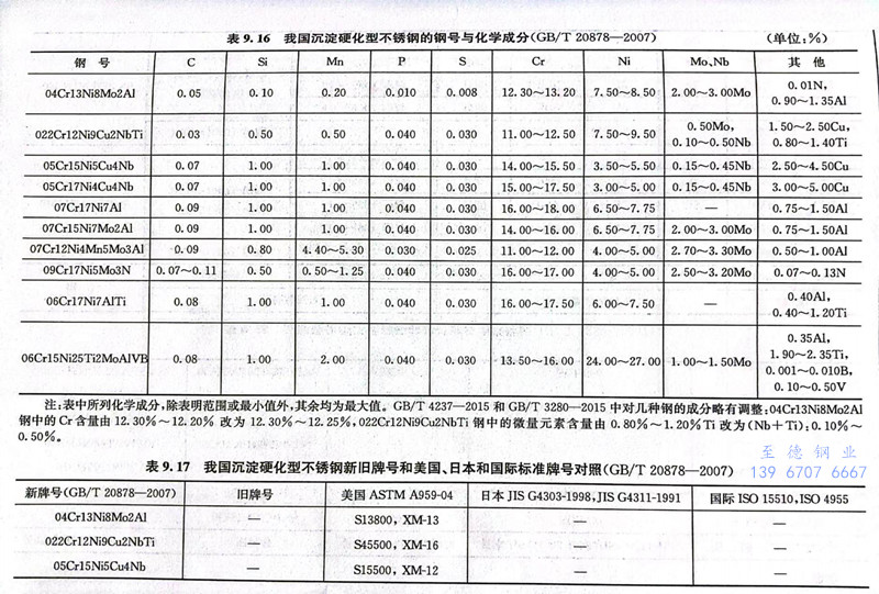 我國列入GB/T 20878-2007的馬氏體沉淀硬化不銹鋼的牌號有四個,分別是05Cr17Ni4Cu4Nb、05Cr15Ni5Cu4Nb,022Cr12Ni9Cu2NbTi、04Cr13Ni8Mo2Al,其化學成分、熱處理制度和力學性能分別見表9.16、表9.18、表9.19和表9.20。這四種鋼的化學成分基本上與表9.55中的17-4PH、15-5PH、Costom 455、PH13-8Mo鋼相當。