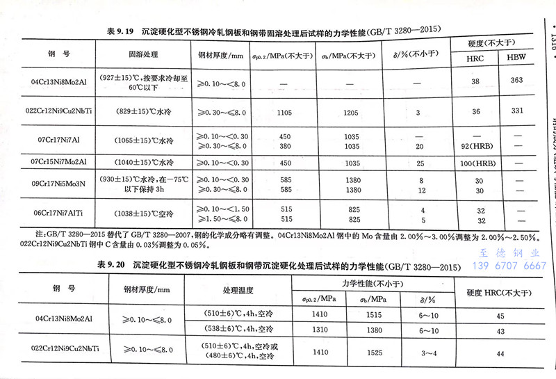 022Cr12Ni9Cu2NbTi、Custom 455 不銹鋼(gang)(gang)在溫(wen)度(du)區間900~1260℃極(ji)易鍛(duan)造,適宜的(de)鍛(duan)造加熱(re)和(he)均(jun)(jun)熱(re)溫(wen)度(du)為(wei)1040~1150℃,終(zhong)鍛(duan)溫(wen)度(du)應控制在815~925℃,可(ke)獲(huo)得較(jiao)細的(de)晶粒尺(chi)寸(cun),鍛(duan)后(hou)(hou)(hou)空冷。鍛(duan)后(hou)(hou)(hou)應進行固溶處(chu)理,固溶溫(wen)度(du)為(wei)816~843℃,隨后(hou)(hou)(hou)快冷,若截(jie)面較(jiao)小可(ke)以(yi)(yi)水淬(cui),組織(zhi)為(wei)全(quan)馬氏(shi)體組織(zhi),硬度(du)為(wei)30~35HRC。生產(chan)企業一般均(jun)(jun)以(yi)(yi)固溶狀(zhuang)態的(de)產(chan)品(pin)供貨,用戶加工后(hou)(hou)(hou)只需(xu)進行時(shi)(shi)效(xiao)處(chu)理以(yi)(yi)獲(huo)得最(zui)后(hou)(hou)(hou)的(de)性(xing)能(neng)。時(shi)(shi)效(xiao)溫(wen)度(du)可(ke)在480~560℃選擇,保(bao)溫(wen)4h,空冷,時(shi)(shi)效(xiao)后(hou)(hou)(hou)的(de)尺(chi)寸(cun)變化僅為(wei)-0.001mm/mm。固溶和(he)時(shi)(shi)效(xiao)處(chu)理后(hou)(hou)(hou)鋼(gang)(gang)的(de)力學性(xing)能(neng)見表(biao)9.19和(he)表(biao)9.20。