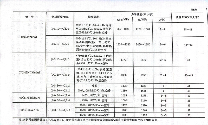 06Cr17Ni7AlTi 不銹鋼是在07Cr17Ni7Al 不銹鋼基礎上適當降低鋁含量并添加鈦而開發出的鋼種,加入鈦可以防止鋼的晶間腐蝕。該鋼的熱處理工藝和力學性能見表9.19和表9.20。