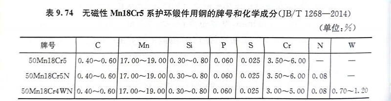 表(biao)(biao)9.74為無磁性護環用(yong)Mn18Cr5系鍛件(jian)用(yong)鋼的牌號和化(hua)學(xue)成分(fen)。表(biao)(biao)9.75為Mn18Cr5系鍛件(jian)用(yong)鋼的強(qiang)度級別。