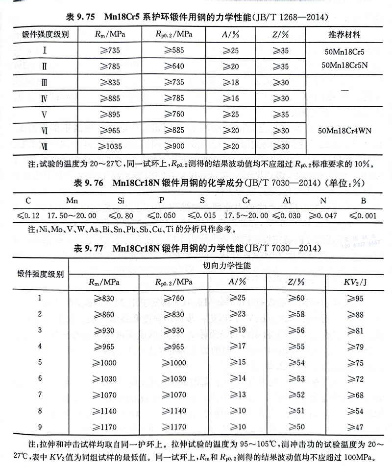 表9.76和表9.77分別為Mn18Cr18N鋼的(de)化學(xue)成分和力學(xue)性能。