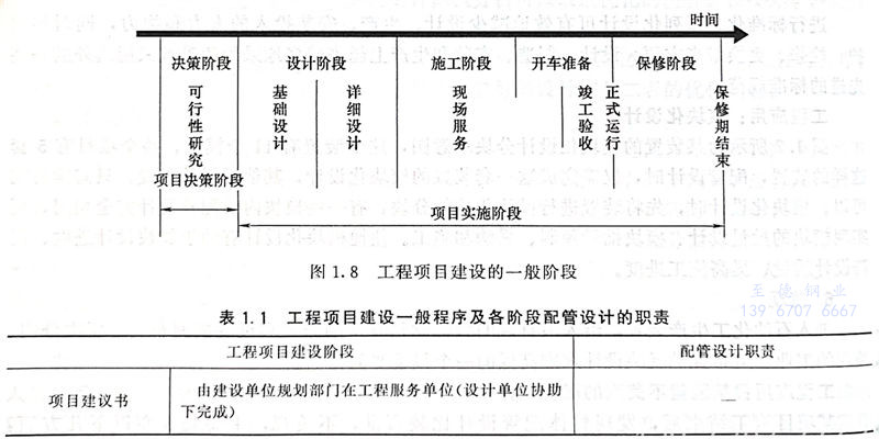 石油(you)化(hua)工(gong)廠的(de)(de)設(she)計是一(yi)個復雜的(de)(de)系(xi)統工(gong)程,從(cong)規劃(hua)到工(gong)程設(she)計、施工(gong)建(jian)(jian)設(she)、裝置的(de)(de)運行改造等各(ge)(ge)階(jie)段都會(hui)傾注(zhu)項目團(tuan)隊的(de)(de)心血,它(ta)是各(ge)(ge)專業(ye)團(tuan)結協(xie)作、辛(xin)勤勞動(dong)的(de)(de)結晶(jing)。工(gong)程項目建(jian)(jian)設(she)的(de)(de)一(yi)般(ban)階(jie)段如圖1.8所示。工(gong)程項目建(jian)(jian)設(she)一(yi)般(ban)程序(xu)及各(ge)(ge)階(jie)段配管設(she)計的(de)(de)職責見表1.1。