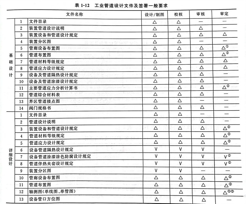 壓力(li)(li)管(guan)(guan)道(dao)專(zhuan)業設計(ji)(ji)文(wen)件及簽(qian)(qian)署要(yao)(yao)求(qiu)見國家和(he)行業標準規定(ding),各設計(ji)(ji)單(dan)(dan)位(wei)可能不同。根據規范(fan)要(yao)(yao)求(qiu),文(wen)件目錄和(he)管(guan)(guan)道(dao)布置圖需要(yao)(yao)蓋(gai)設計(ji)(ji)單(dan)(dan)位(wei)壓力(li)(li)管(guan)(guan)道(dao)印章。工業管(guan)(guan)道(dao)設計(ji)(ji)文(wen)件及簽(qian)(qian)署一(yi)般要(yao)(yao)求(qiu)見表1-12。筆者考察了國外一(yi)些設計(ji)(ji)單(dan)(dan)位(wei)的壓力(li)(li)管(guan)(guan)道(dao)設計(ji)(ji)文(wen)件及簽(qian)(qian)署要(yao)(yao)求(qiu),為了保證(zheng)設計(ji)(ji)質(zhi)量,對壓力(li)(li)管(guan)(guan)道(dao)設計(ji)(ji)文(wen)件的深度(du)及多級(ji)簽(qian)(qian)署要(yao)(yao)求(qiu)均非常嚴格(ge),例(li)如,有的國外設計(ji)(ji)單(dan)(dan)位(wei)要(yao)(yao)求(qiu)三(san)維模(mo)型抽出(chu)的重要(yao)(yao)管(guan)(guan)線軸測圖至少4級(ji)校審簽(qian)(qian)署。