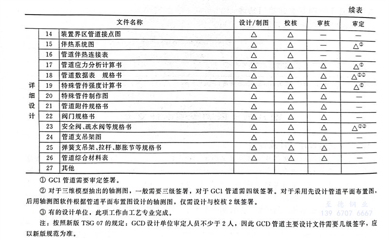 注:按(an)照原TSG R1001規定GB1、GB2級管道(dao)主(zhu)要設(she)(she)計文件需要3級簽(qian)署,但是按(an)照新版(ban)TSG07的規定:GB1設(she)(she)計單(dan)位審定人員不少于2人,因(yin)此GB1管道(dao)主(zhu)要設(she)(she)計文件簽(qian)署級別,應以新版(ban)規范(fan)為準。