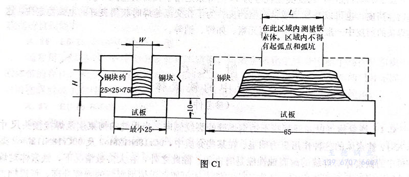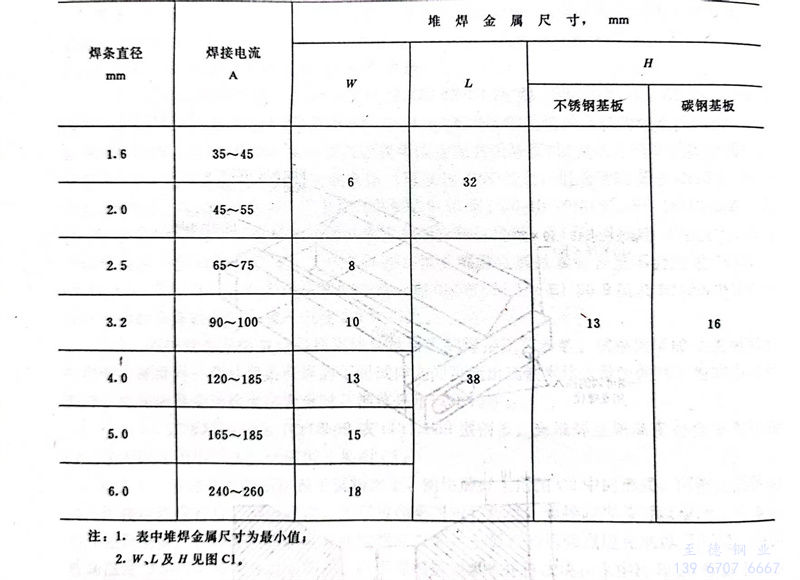 4.1 試(shi)板材料應為1Cr18Ni9或0Cr18Ni9型(xing)鋼板。當(dang)堆(dui)焊金(jin)屬(shu)高(gao)度符合下表規定時,也可以用碳鋼試(shi)板。試(shi)板尺寸見圖(tu)C1。