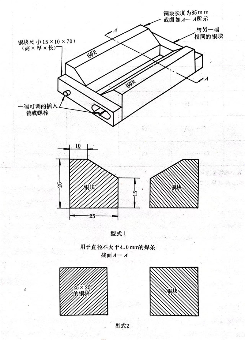 4.2 將兩(liang)(liang)平行(xing)的銅(tong)(tong)塊(kuai)置于試板之(zhi)上(shang),銅(tong)(tong)塊(kuai)最好采用(yong)圖(tu)C2中(zhong)的形式。兩(liang)(liang)銅(tong)(tong)塊(kuai)間(jian)的距(ju)離及焊(han)(han)(han)接電流應(ying)(ying)符合下(xia)表的規定。應(ying)(ying)盡可(ke)能采用(yong)短弧(hu)焊(han)(han)(han)接,焊(han)(han)(han)接時焊(han)(han)(han)條(tiao)可(ke)以擺(bai)動,但電弧(hu)不許觸(chu)及銅(tong)(tong)塊(kuai)。各(ge)焊(han)(han)(han)道(dao)間(jian)的焊(han)(han)(han)接方向(xiang)應(ying)(ying)相(xiang)互(hu)交替,起弧(hu)點(dian)和熄(xi)弧(hu)點(dian)應(ying)(ying)在(zai)堆焊(han)(han)(han)層兩(liang)(liang)端。層間(jian)最高溫(wen)度為95℃,每條(tiao)焊(han)(han)(han)道(dao)焊(han)(han)(han)完(wan)后(hou)(hou),應(ying)(ying)清(qing)理焊(han)(han)(han)道(dao)表面,并(bing)將試塊(kuai)在(zai)水中(zhong)冷(leng)卻(que)20秒以上(shang)。在(zai)最后(hou)(hou)一條(tiao)焊(han)(han)(han)道(dao)水冷(leng)之(zhi)前(qian),應(ying)(ying)將試塊(kuai)在(zai)空氣中(zhong)冷(leng)卻(que)到430℃以下(xia)。
