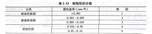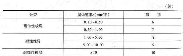 評定均勻腐(fu)(fu)蝕(shi)的(de)(de)方法(fa)是(shi)在試驗條件(jian)下,測出單(dan)位面積上經一定時(shi)間腐(fu)(fu)蝕(shi)以(yi)后所損失的(de)(de)重量(g/㎡·年(nian)),即(ji)為腐(fu)(fu)蝕(shi)速(su)率(lv),若以(yi)被(bei)腐(fu)(fu)蝕(shi)的(de)(de)深度(mm/年(nian))計(ji),則更便于(yu)(yu)計(ji)算設備(bei)的(de)(de)耐(nai)蝕(shi)壽命。根據(ju)(ju)腐(fu)(fu)蝕(shi)速(su)率(lv)不同,可將金屬(shu)材料的(de)(de)耐(nai)蝕(shi)性分為10級(ji),見表1-13。根據(ju)(ju)不同的(de)(de)使用(yong)情(qing)況對耐(nai)蝕(shi)性一般分為兩(liang)大等級(ji):腐(fu)(fu)蝕(shi)速(su)率(lv)小(xiao)于(yu)(yu)0.01mm/年(nian)的(de)(de),認為是(shi)“完全耐(nai)蝕(shi)”;腐(fu)(fu)蝕(shi)速(su)率(lv)小(xiao)于(yu)(yu)0.1mm/年(nian)的(de)(de),認為是(shi)“耐(nai)蝕(shi)”。這里顯然意味著,腐(fu)(fu)蝕(shi)速(su)率(lv)超過0.1mm/年(nian),屬(shu)于(yu)(yu)不耐(nai)蝕(shi)或不太耐(nai)蝕(shi)。此(ci)外,還有別的(de)(de)分級(ji)方法(fa),在此(ci)僅舉此(ci)一種。