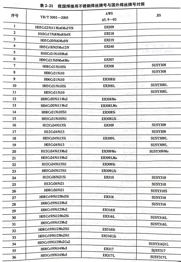 我國焊接不銹鋼焊絲牌(pai)號與(yu)國外焊絲的對(dui)照見表 2-21.