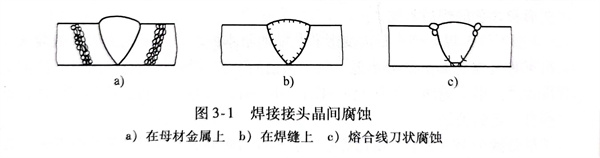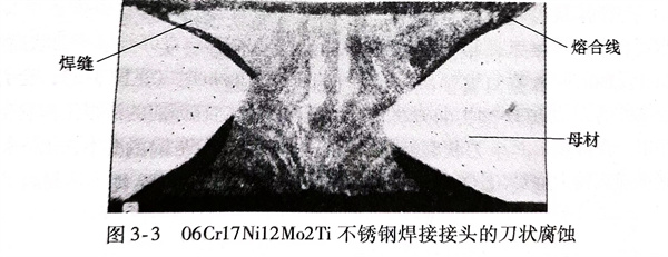 在18-8型不銹鋼(gang)的焊縫金屬中滲入穩定化合金元素鈦、鈮、鋯等,可以消除圖3-1a和圖3-1b兩種形式的晶間腐蝕,但又可能會出現如圖3-1c中的腐蝕現象,即順著焊縫金屬的熔合線發生像刀切一樣的腐蝕,稱它為刀狀腐蝕。刀狀腐蝕是順著焊縫熔合線向板厚度方向深人,并慢慢地向母材金屬和焊縫金屬發展,如圖3-3所示。刀狀腐蝕將成為制約焊接結構使用壽命的薄弱環節。
