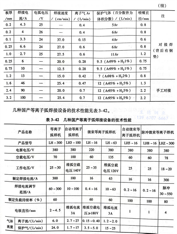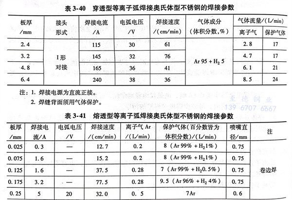 表3-40、表3-41為穿透型和熔透型等離子弧焊接奧(ao)氏體不銹鋼的焊接參數。