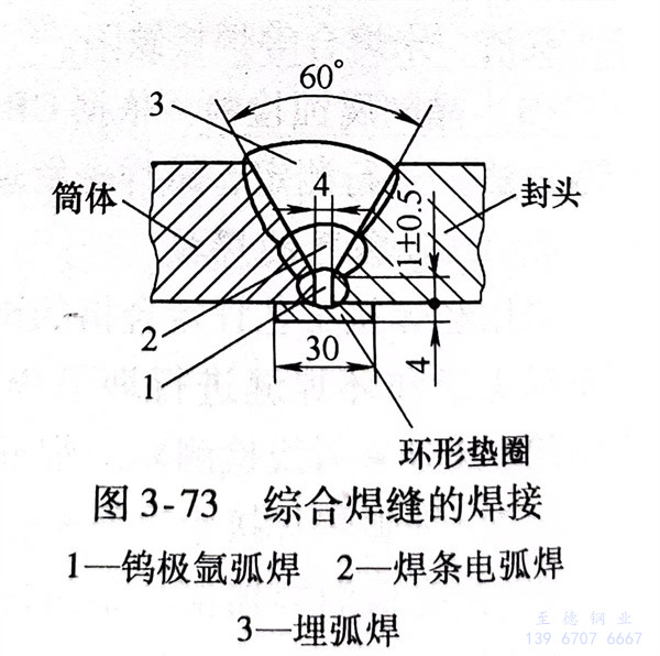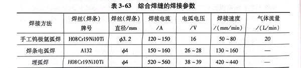 內(nei)(nei)容器是(shi)一個(ge)密封容器(除輸入、輸出液管路外),沒有人孔裝置,焊(han)(han)(han)(han)接設備和(he)人員無法進(jin)入容器內(nei)(nei)操作。采用(yong)的(de)焊(han)(han)(han)(han)接工藝如圖3-73所(suo)示。內(nei)(nei)環(huan)縫(feng)(feng)增加了(le)一個(ge)環(huan)形(xing)墊(dian)圈,材質(zhi)與內(nei)(nei)容器材質(zhi)相同,墊(dian)圈厚度為4mm,寬度為30mm。先用(yong)鎢(wu)極(ji)氬弧焊(han)(han)(han)(han)進(jin)行(xing)打底焊(han)(han)(han)(han),保證焊(han)(han)(han)(han)透(tou)實現單面焊(han)(han)(han)(han)雙面成形(xing),通(tong)過(guo)100%射線(xian)檢(jian)(jian)(jian)測(ce)判片合(he)格后(hou),進(jin)行(xing)第2層(ceng)焊(han)(han)(han)(han)條電弧焊(han)(han)(han)(han),其目的(de)是(shi)提高焊(han)(han)(han)(han)縫(feng)(feng)厚度,防止埋弧焊(han)(han)(han)(han)時由于熔(rong)深(shen)過(guo)大而將打底焊(han)(han)(han)(han)焊(han)(han)(han)(han)縫(feng)(feng)焊(han)(han)(han)(han)穿。第3層(ceng)環(huan)形(xing)焊(han)(han)(han)(han)縫(feng)(feng)用(yong)埋弧焊(han)(han)(han)(han)完成。各(ge)層(ceng)焊(han)(han)(han)(han)縫(feng)(feng)的(de)焊(han)(han)(han)(han)接參數見表(biao)3-63。焊(han)(han)(han)(han)后(hou)將環(huan)焊(han)(han)(han)(han)縫(feng)(feng)進(jin)行(xing)滲透(tou)檢(jian)(jian)(jian)測(ce)和(he)射線(xian)檢(jian)(jian)(jian)測(ce)合(he)格后(hou)再進(jin)行(xing)無油干燥(zao)氣壓試驗和(he)氮質(zhi)譜真(zhen)空檢(jian)(jian)(jian)漏。全部滿足(zu)圖樣技術性能要求后(hou)才能與外容器進(jin)行(xing)組裝。