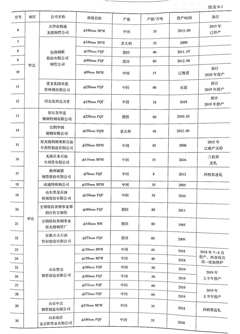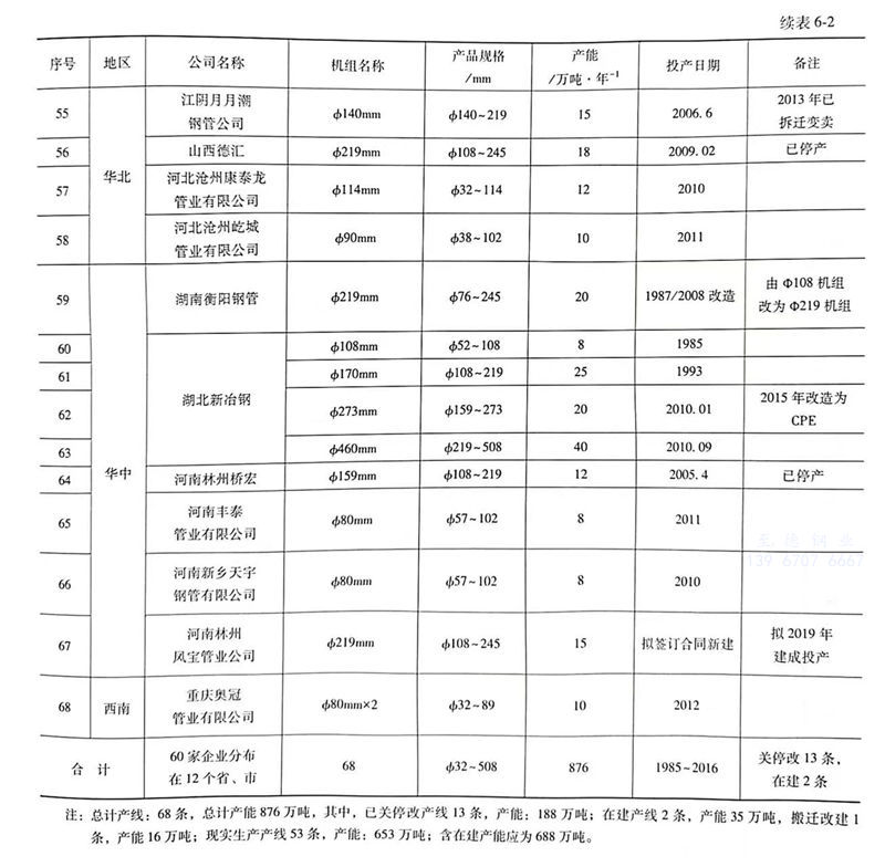 據不完全(quan)(quan)統計,截(jie)至2018年(nian)底我(wo)國已擁有(you)各(ge)類(lei)熱(re)軋無(wu)(wu)縫鋼管(guan)(guan)完整(zheng)的生產(chan)(chan)線(連軋管(guan)(guan)、精密/斜軋管(guan)(guan)、三(san)輥軋管(guan)(guan)、自動軋管(guan)(guan)、頂(ding)管(guan)(guan)、擠壓管(guan)(guan)、周期軋管(guan)(guan)等)達239條,產(chan)(chan)能(neng)(neng)規(gui)模突破4500萬(wan)(wan)噸(dun),為4519萬(wan)(wan)噸(dun)。近(jin)年(nian)來由于(yu)淘汰落后產(chan)(chan)能(neng)(neng)和(he)部(bu)(bu)分企業停(ting)產(chan)(chan)或破產(chan)(chan),使(shi)部(bu)(bu)分機(ji)組(zu)關(guan)(guan)、停(ting)或拆除(chu),現實(shi)際產(chan)(chan)能(neng)(neng)為3574萬(wan)(wan)噸(dun),占(zhan)全(quan)(quan)國無(wu)(wu)縫鋼管(guan)(guan)產(chan)(chan)能(neng)(neng)比重87.73%;另外,還有(you)φ90mm及以(yi)下穿孔/冷(leng)(leng)拔(ba)(軋)無(wu)(wu)縫鋼管(guan)(guan)生產(chan)(chan)線約(yue)(yue)(yue)220條,產(chan)(chan)能(neng)(neng)約(yue)(yue)(yue)500萬(wan)(wan)噸(dun),占(zhan)全(quan)(quan)國無(wu)(wu)縫鋼管(guan)(guan)產(chan)(chan)能(neng)(neng)比重12.27%;熱(re)軋無(wu)(wu)縫鋼管(guan)(guan)機(ji)組(zu)數量加穿孔+冷(leng)(leng)軋/拔(ba)線數量,總計約(yue)(yue)(yue)459套(臺),產(chan)(chan)能(neng)(neng)約(yue)(yue)(yue)5019萬(wan)(wan)噸(dun),去除(chu)關(guan)(guan)、停(ting)、拆機(ji)組(zu)的產(chan)(chan)能(neng)(neng)945萬(wan)(wan)噸(dun),我(wo)國無(wu)(wu)縫鋼管(guan)(guan)實(shi)際產(chan)(chan)能(neng)(neng)約(yue)(yue)(yue)4074萬(wan)(wan)噸(dun)(含在建機(ji)組(zu)產(chan)(chan)能(neng)(neng))。